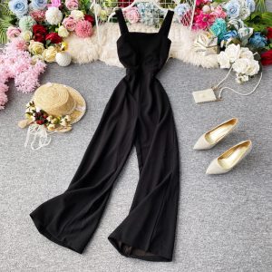 Summer Solid Color Sleeveles Korean SimpleTemperamental Slim-Fit Jumpsuit Draping Wide-Leg Trousers Suspender Jumpsuit for Women