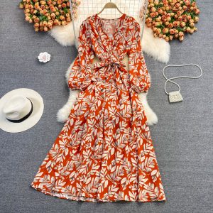 Puff Sleeve V-neck Dress Autumn New Waist Slimming Elegant Floral Skirt over the Knee Large Swing Dress
