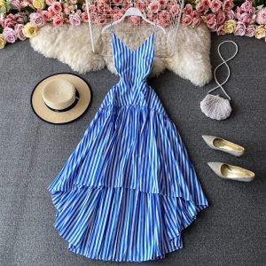 Queen resort irregular stripe dress cultivate one’s morality show thin straps dress skirt seaside holiday beach dress