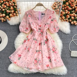 Puff Sleeve Floral Chiffon Dress New V-neck Tight Waist Fairy Skirt Super Mori French First Love Skirt Summer