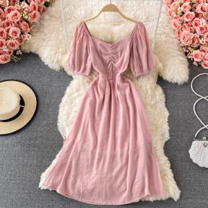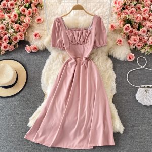 Square Collar Puff Sleeve Dress French Style Retro Waist-Controlled A- line Skirt Summer Gentle Sweet Mid-Length Skirt for Women