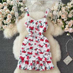 Summer French Style Small V-neck Rose Print Pleated Slim Fit Slimming Flounce Sheath Fishtail Dress
