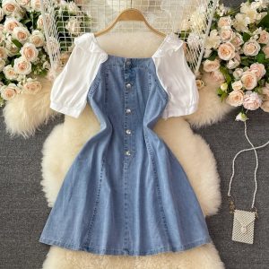 Square Collar Puff Sleeve Denim Dress for Women Summer New Small Waist Slimming Elegant A- line Skirt Short Skirt