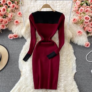 Stand Collar Stretch Knitted Dress Women’s Temperament Mid-Length Skinny Hip Skirt Autumn and Winter Slim Fit Base Sweater Dress