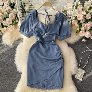 Square Collar Dress Women’s Summer New French Socialite Slimming Pleated Waist Tight Irregular Short Hip Skirt