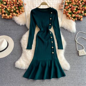 Base sweater bag hip skirt slim slimming fishtail skirt autumn and winter round neck long sleeve temperament knitted dress women
