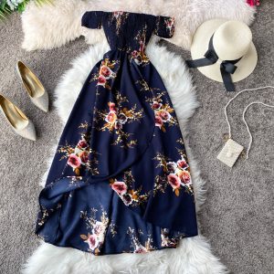 Bohemia resort printed floral dress brought a word shoulder strapless, irregular split dress with short sleeves