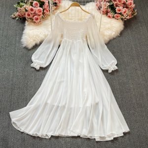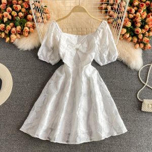 Bow White Square-Cut Collar Dress Summer New French Slimming Gentle First Love Skirt Puff Sleeve Elegant A- line Skirt