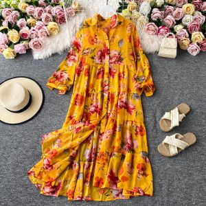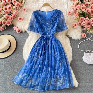 Beach Dress Women’s Seaside Holiday V-neck Dress New Inspirational Backless Waist Slimming Chiffon Floral Dress