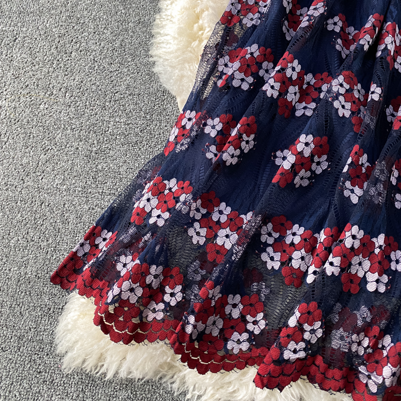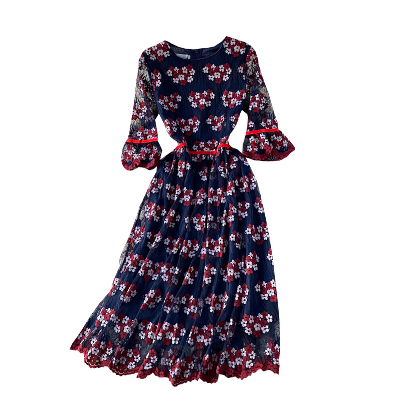 Summer New Fashion Elegant Graceful Round-Neck Flared Sleeves Hollow-out Embroidered Lace Tight Waist Midi dress Dress