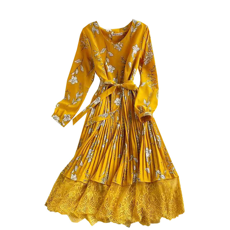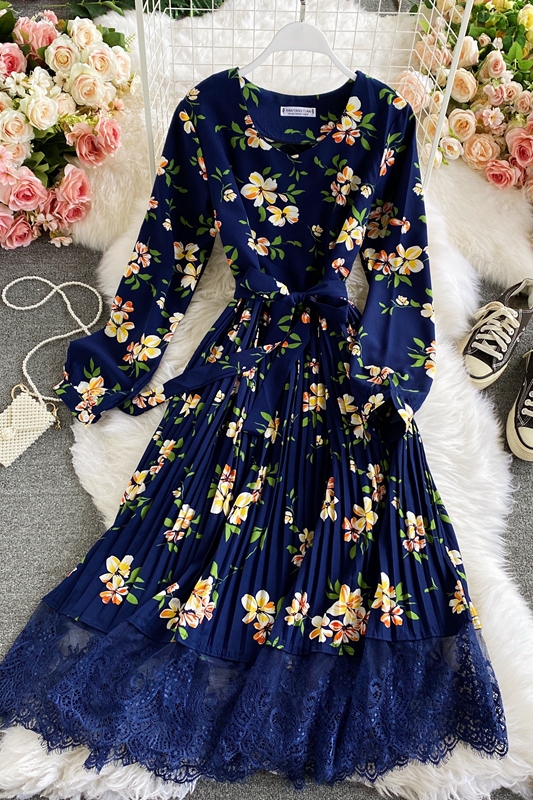 Cheap Dresses, Buy Quality Women’s Clothing Directly from China Suppliers:Retro floral v neck closed show thin waist lace stitching posed long skirt pleated dress color fashion temperament