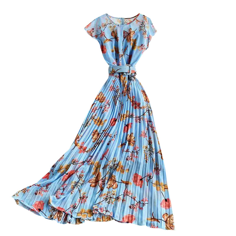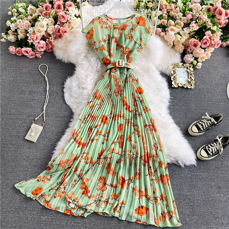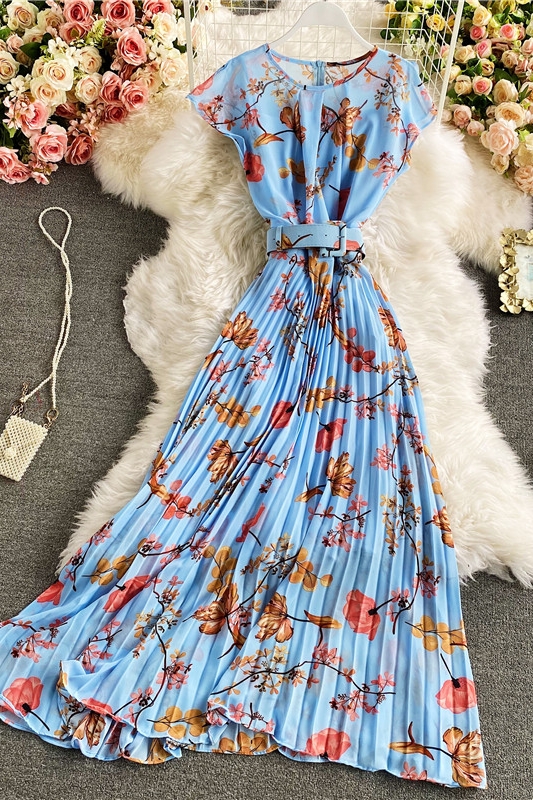 Cheap Dresses, Buy Quality Women’s Clothing Directly from China Suppliers:Floral chiffon dress new holiday wind brim round collar feifei sleeve closed posed long pleated skirt waist show thin