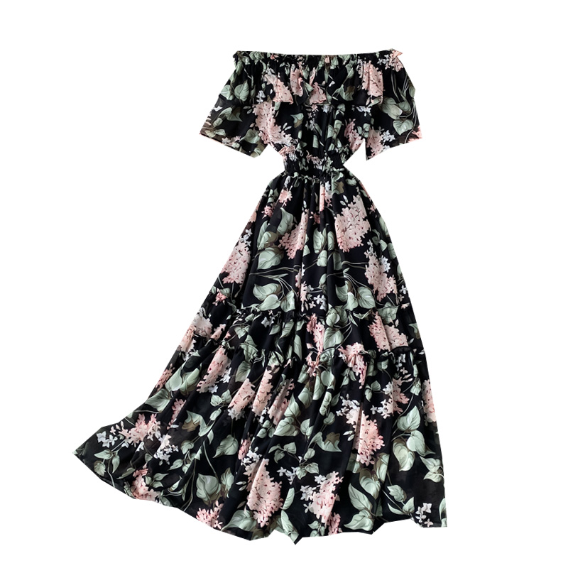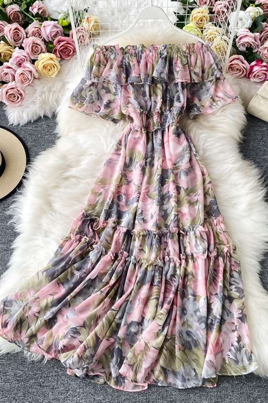 Strapless dress seaside holiday beach dress temperament purple floral skirt waist posed dress chiffon