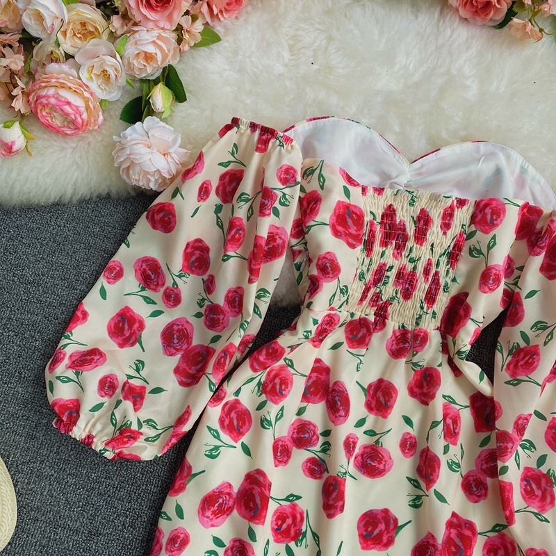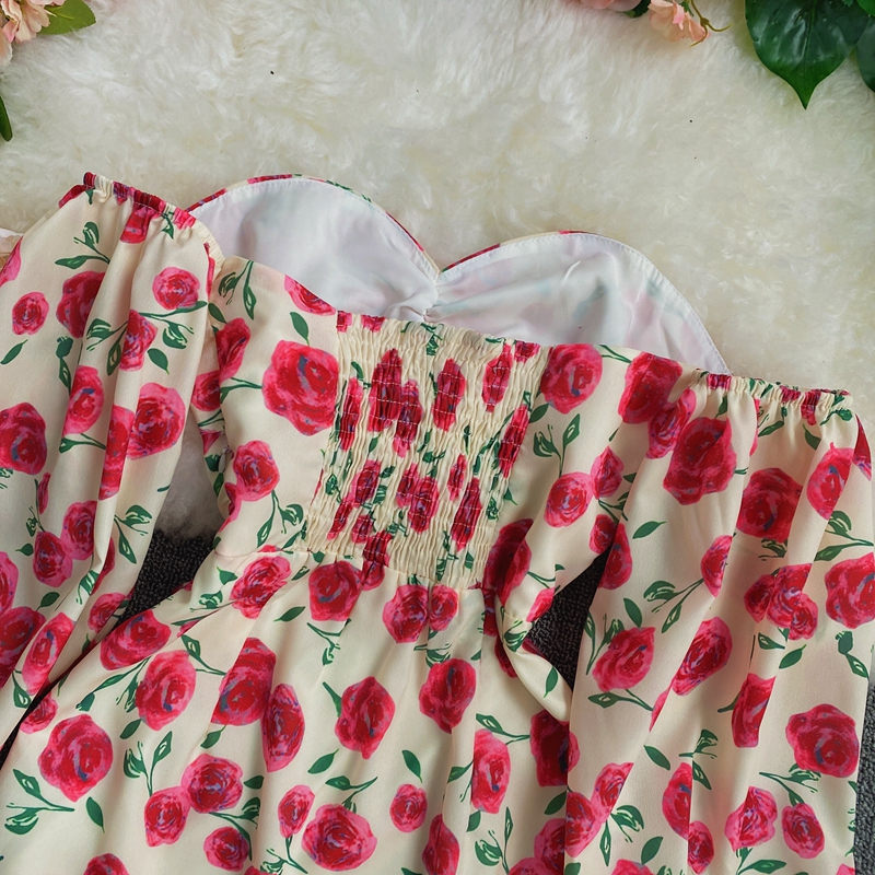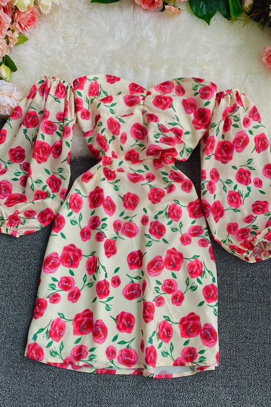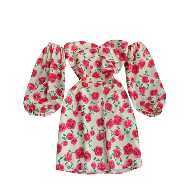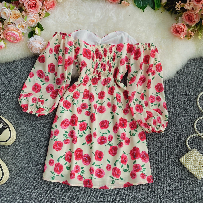 Long sleeve spring new show thin temperament chiffon word brief paragraph off-the-shoulder broken flower skirt