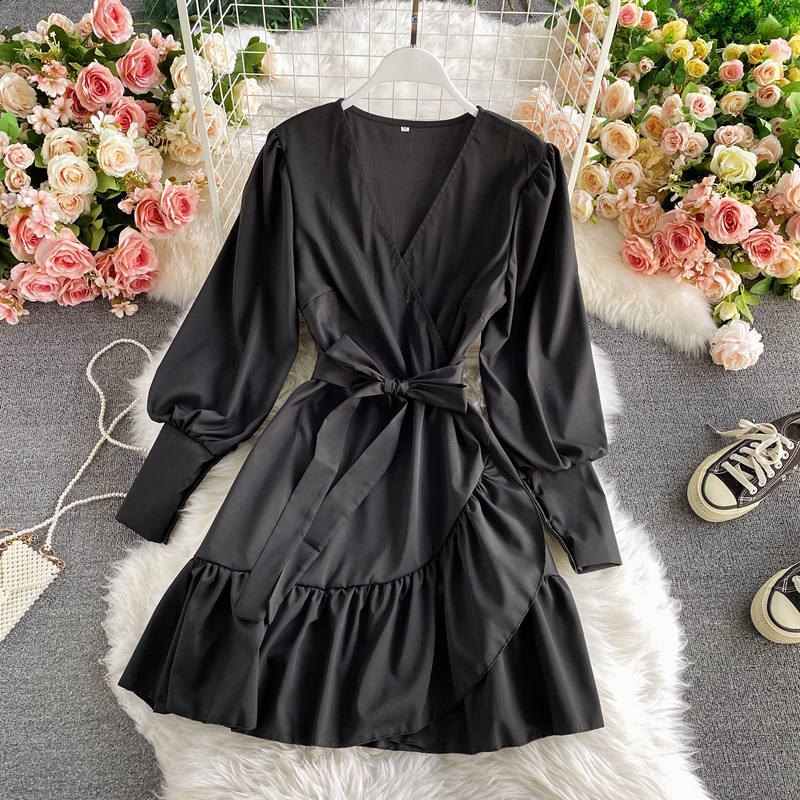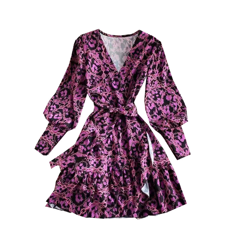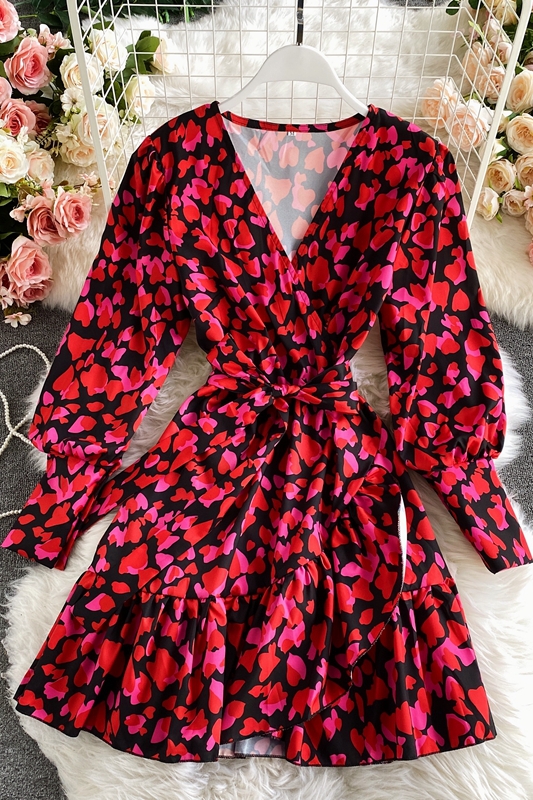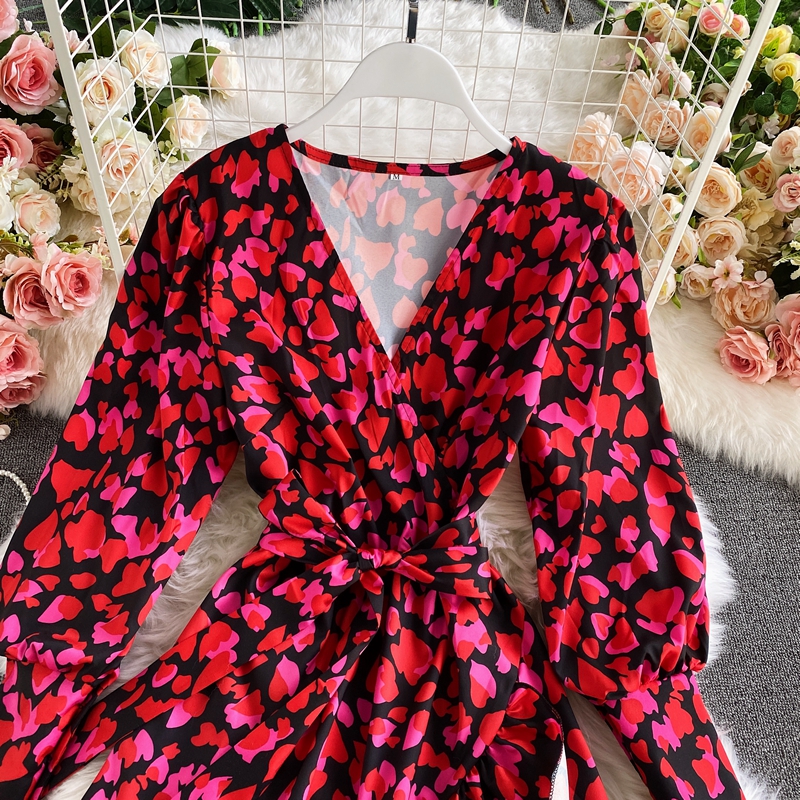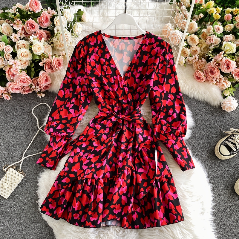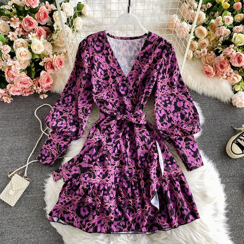 Printed ruffled dress fashion temperament is bound to receive A word skirt show thin waist broken flower skirt