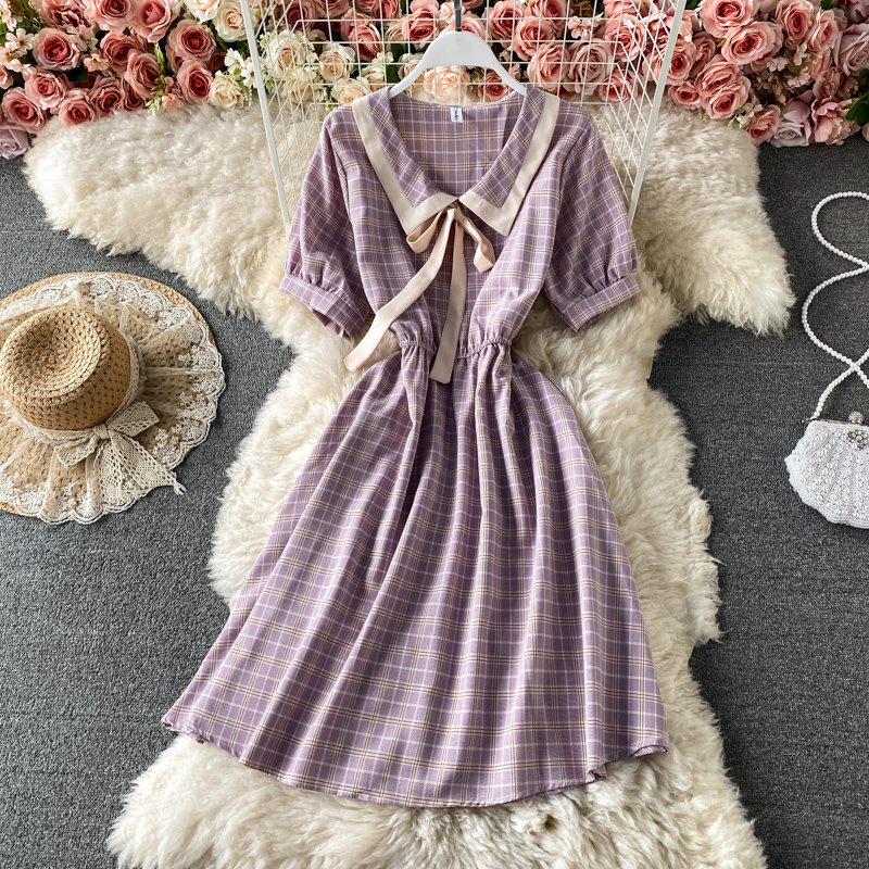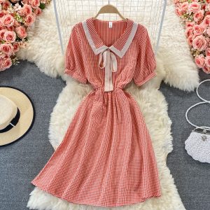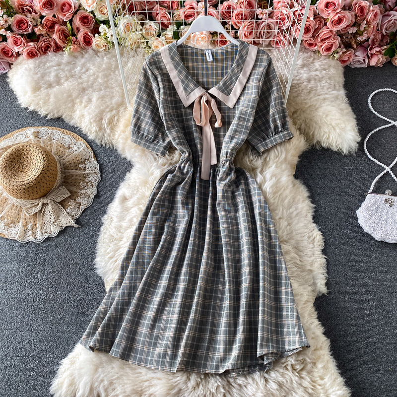 Cheap Dresses, Buy Quality Women’s Clothing Directly from China Suppliers:Summer Little Fresh Sweet Color Matching Doll Collar Lace up Bow High Waist Slimming Plaid Dress Short Sleeve