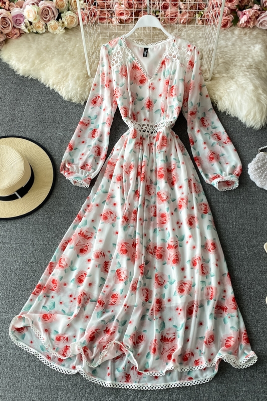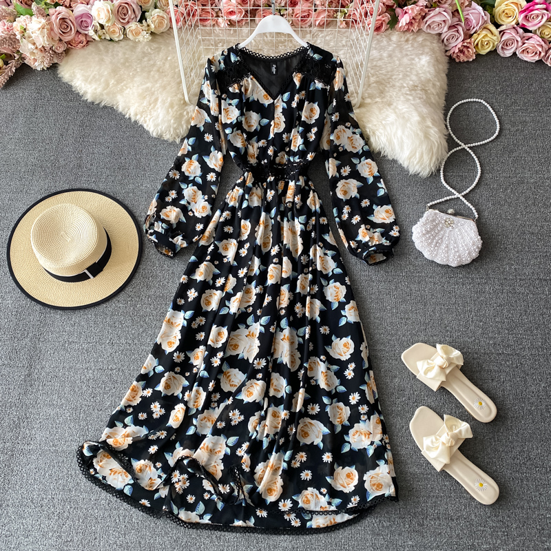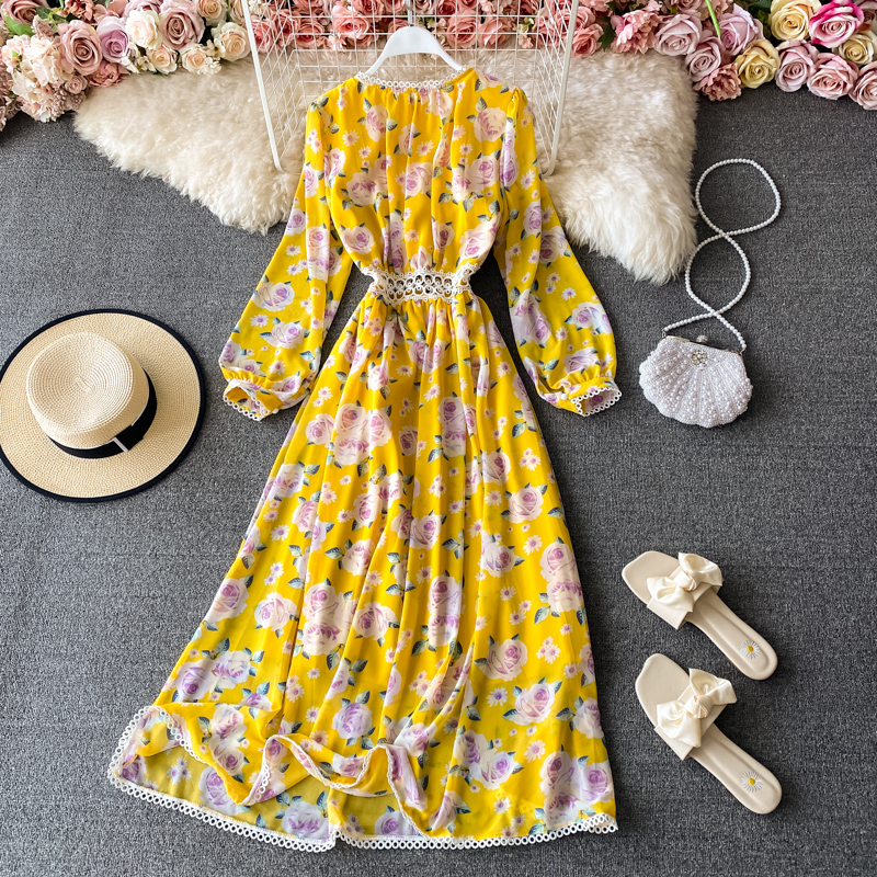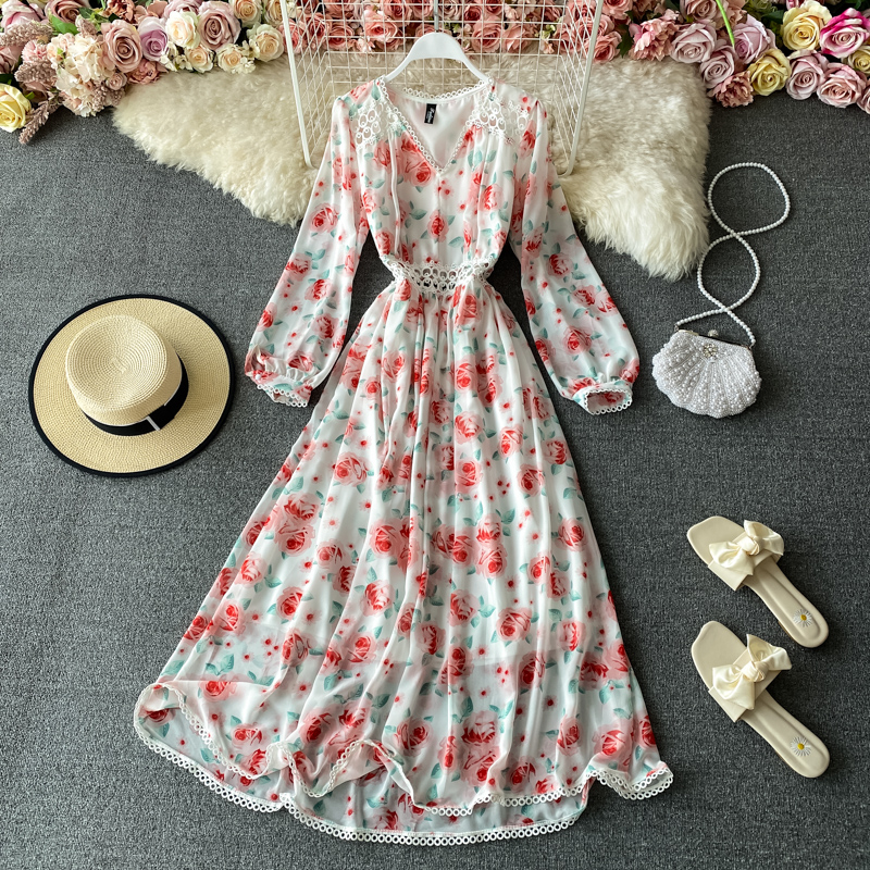 Spring and Autumn New Korean Temperament Goddess Fan Retro V-neck Waist Waist Thin and Large Swing Dress