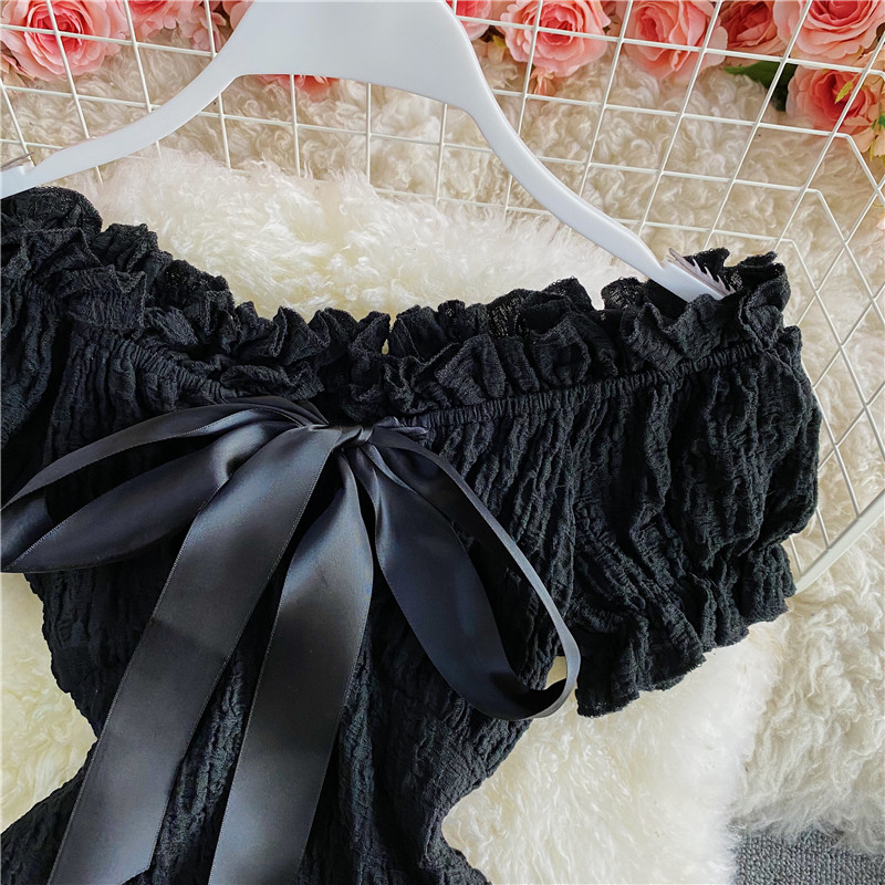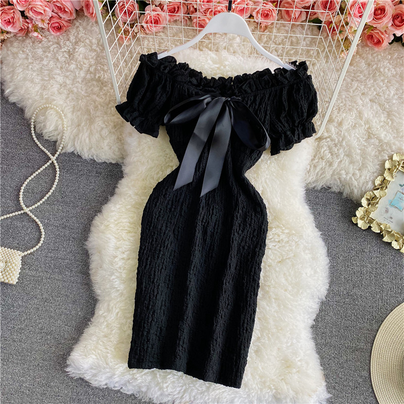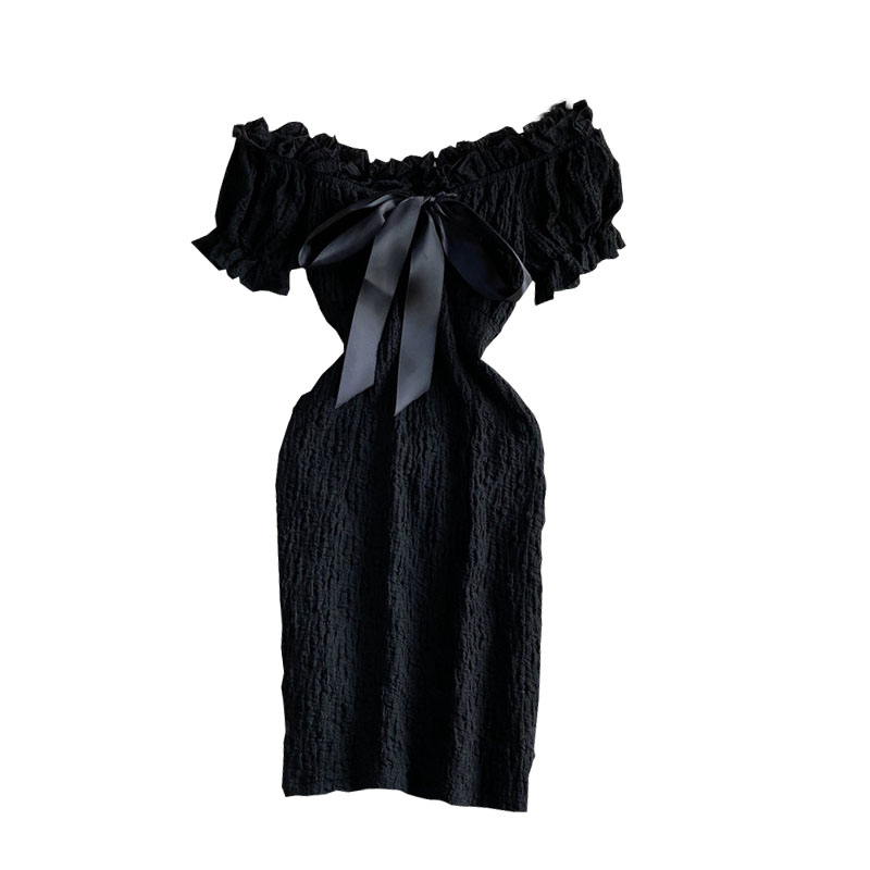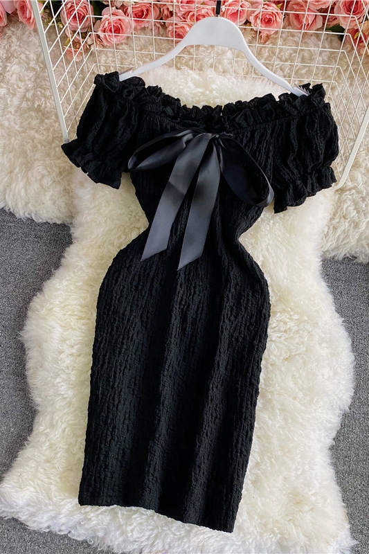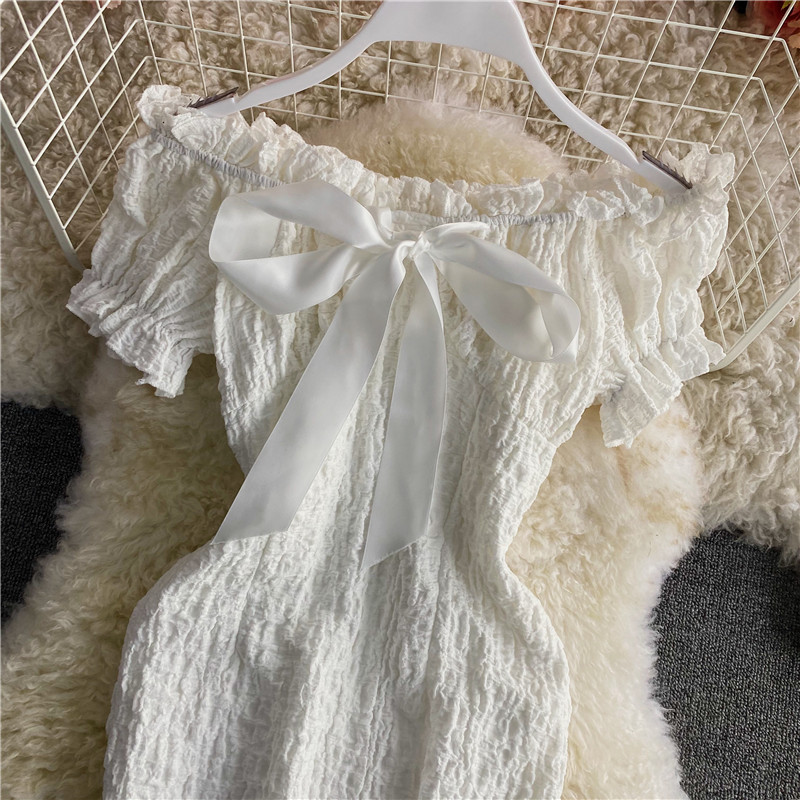 Retro Sweet Cinched Slimming off-Shoulder Backless Dress Summer Small High Waist Short Sleeve Short Hip Skirt