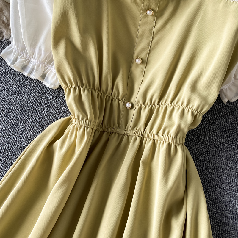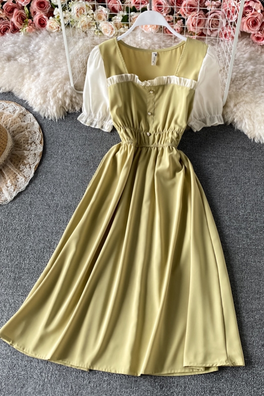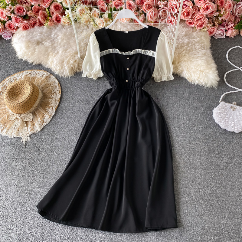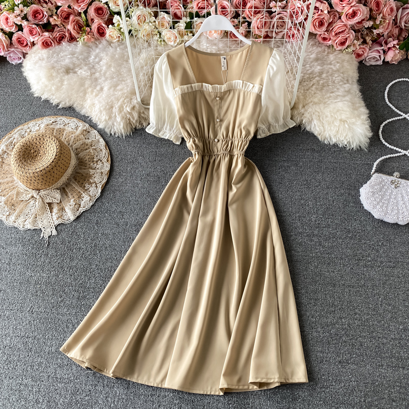 Cheap Dresses, Buy Quality Women’s Clothing Directly from China Suppliers:Retro Fake Two Pieces Square Collar Dress Short Sleeve Spring New Elegant Chic Waist Tight Lady Mid Length Skirt