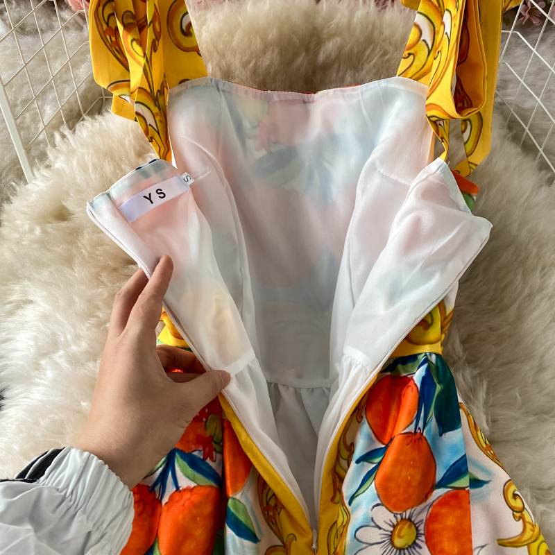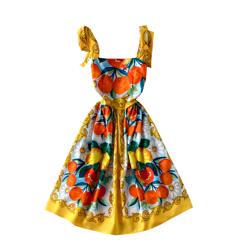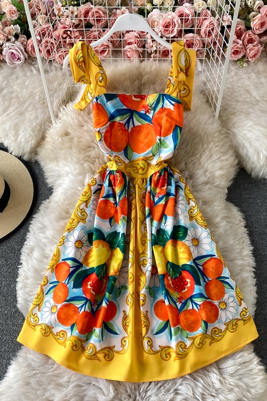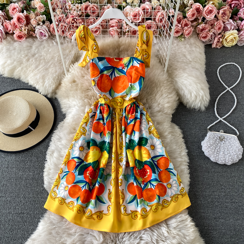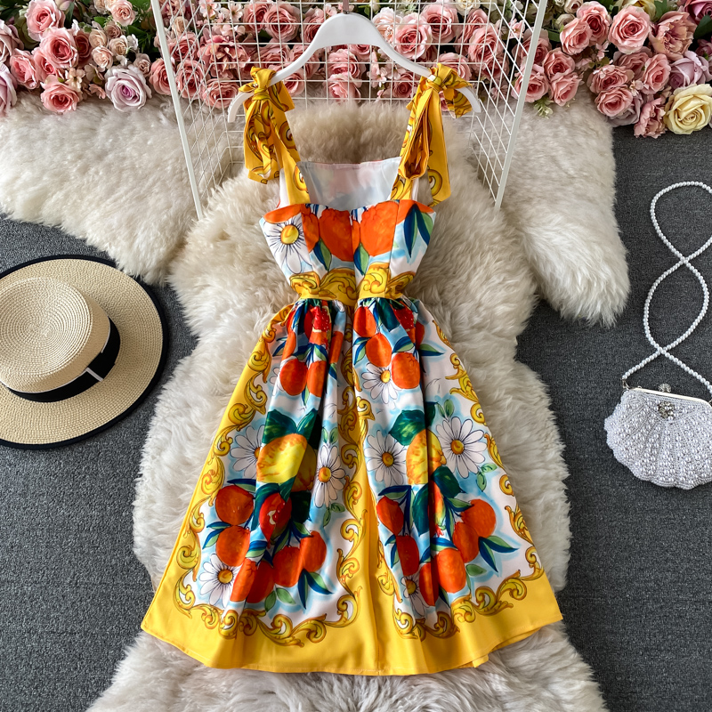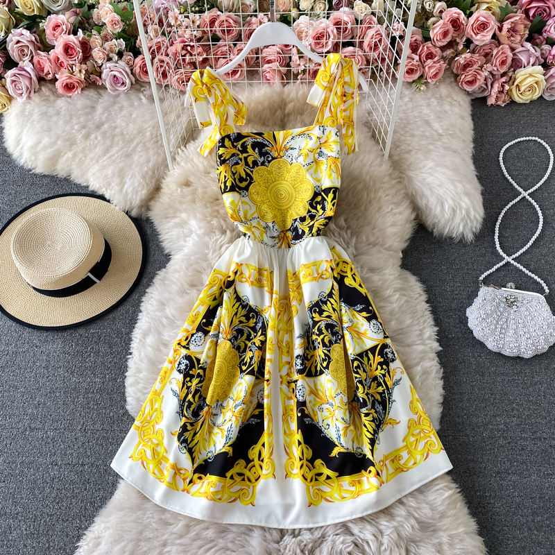 Summer New Bow Bandage Halter Skirt Slim Fit Slim Fit Sweet Printed Age-Reducing Large Swing Dress