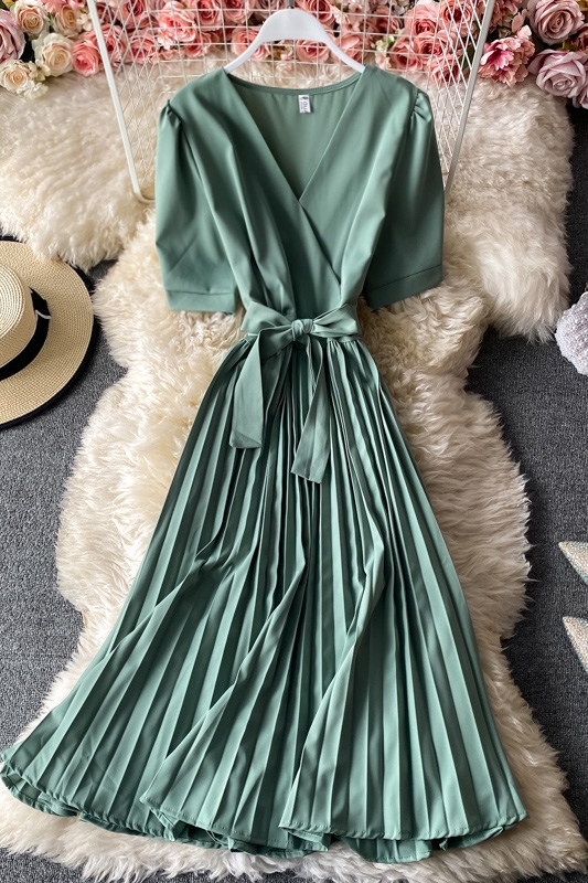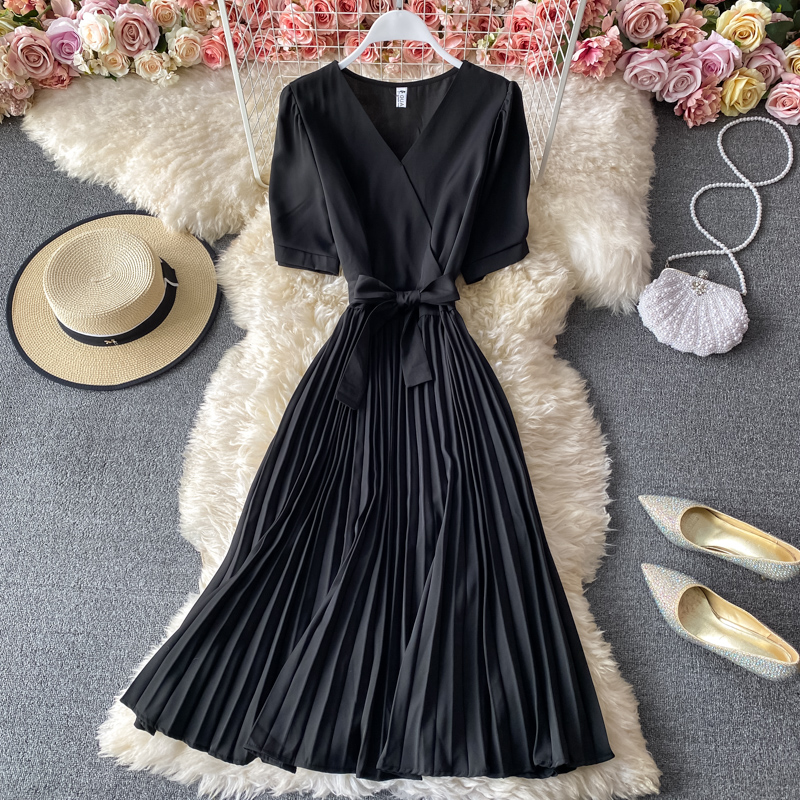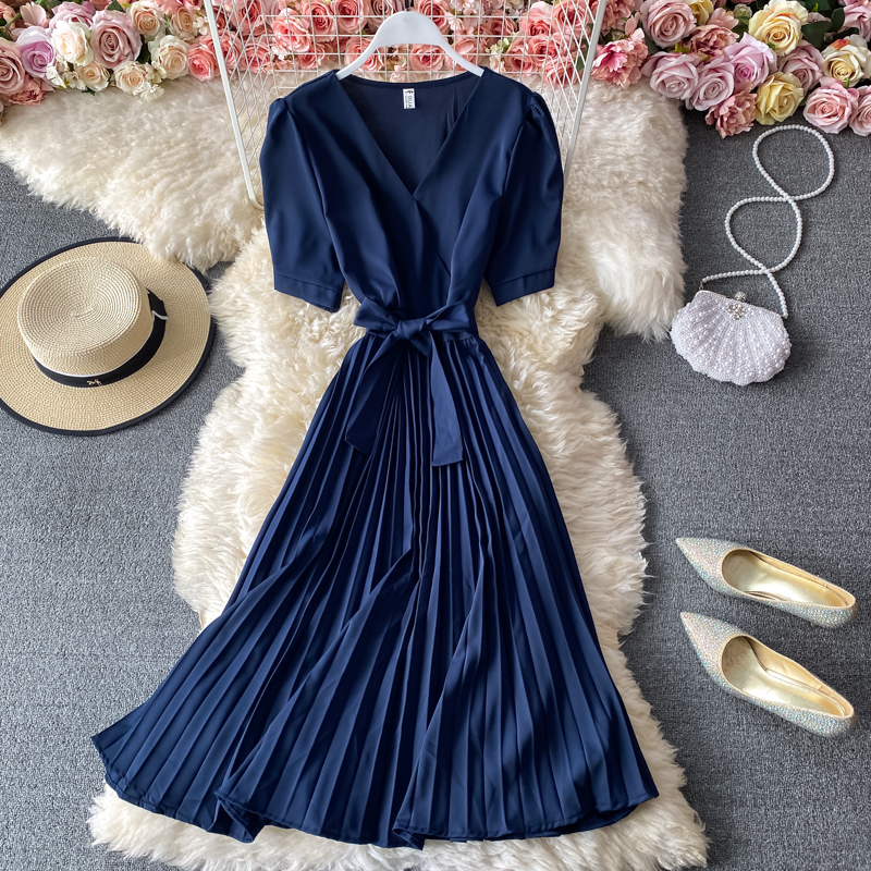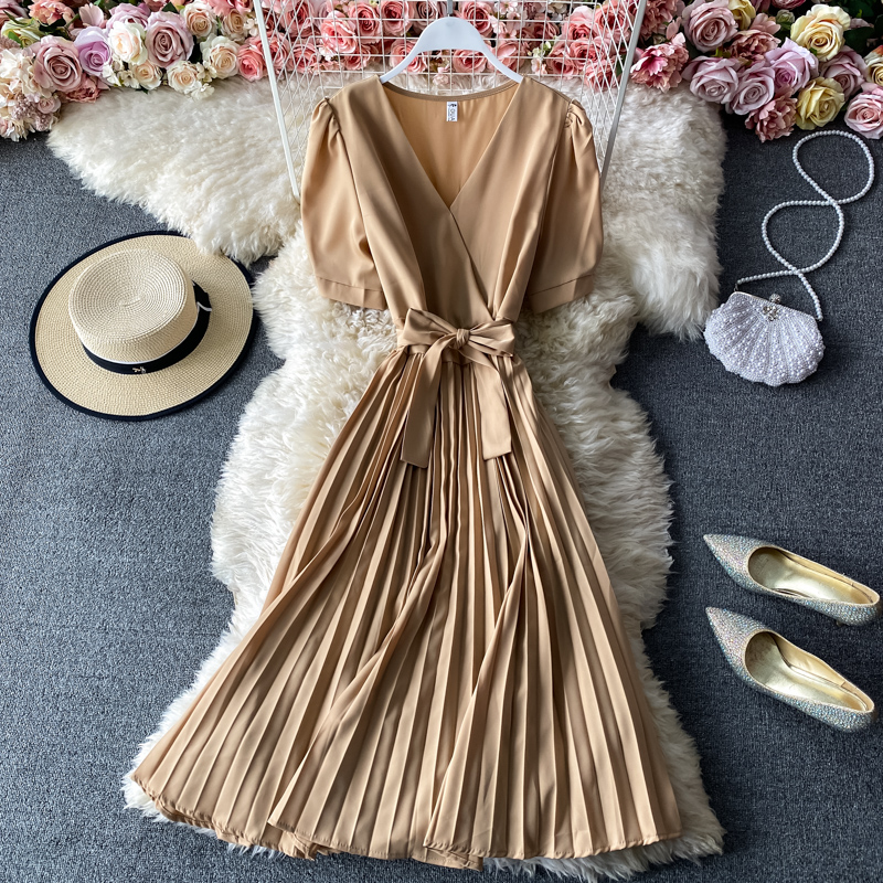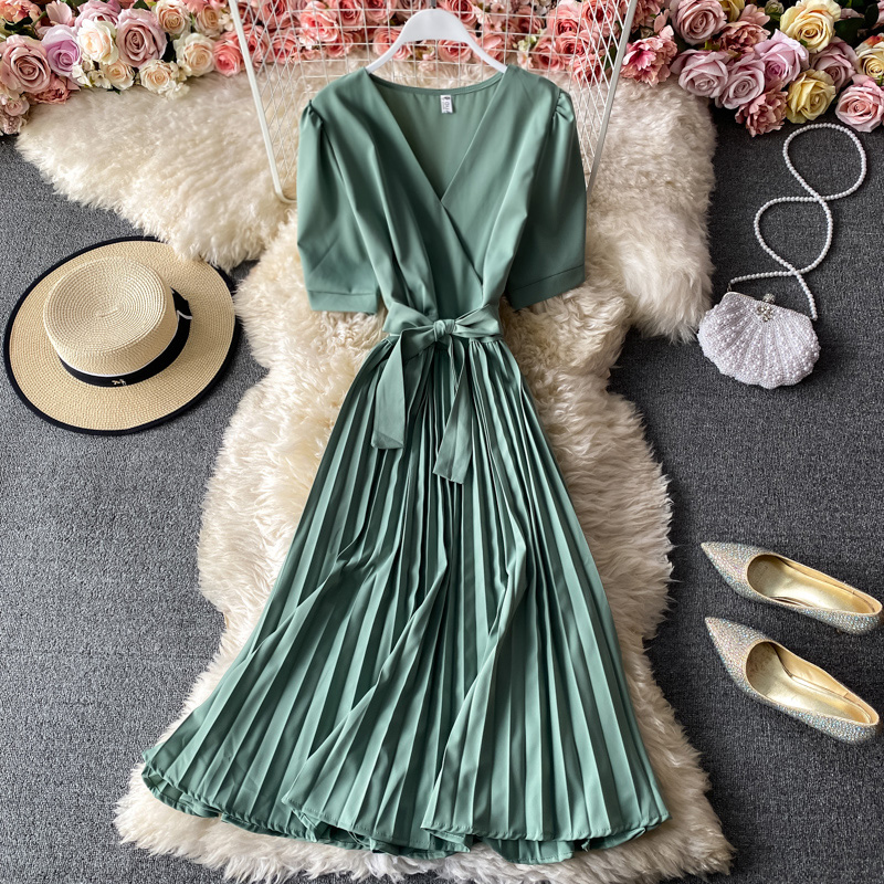 Cheap Dresses, Buy Quality Women’s Clothing Directly from China Suppliers:New Korean style high waist lace up pleated mid length dress Fashion temperament waist solid color a line skirt short sleeves