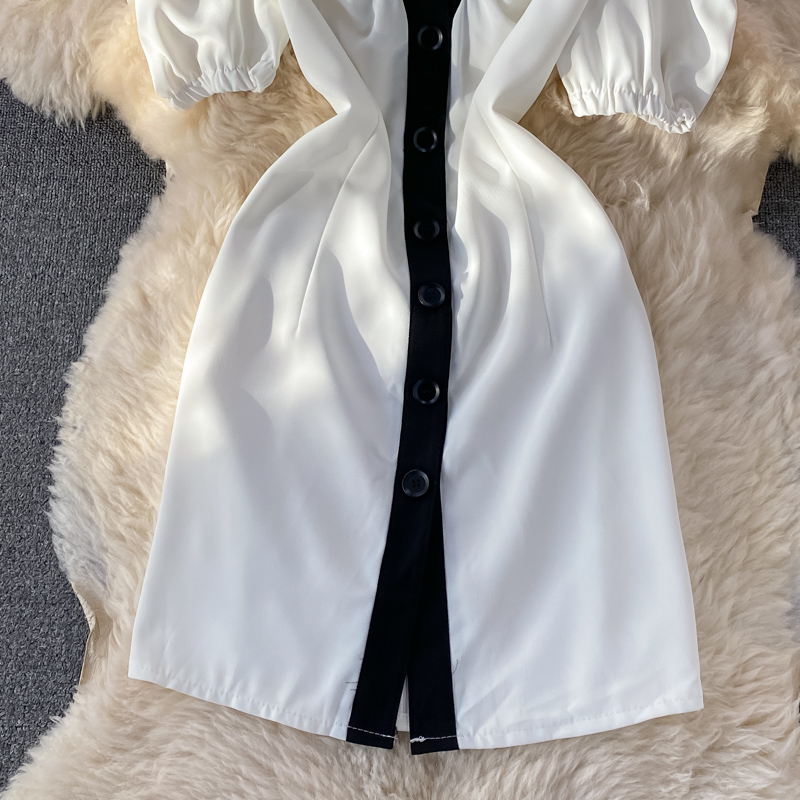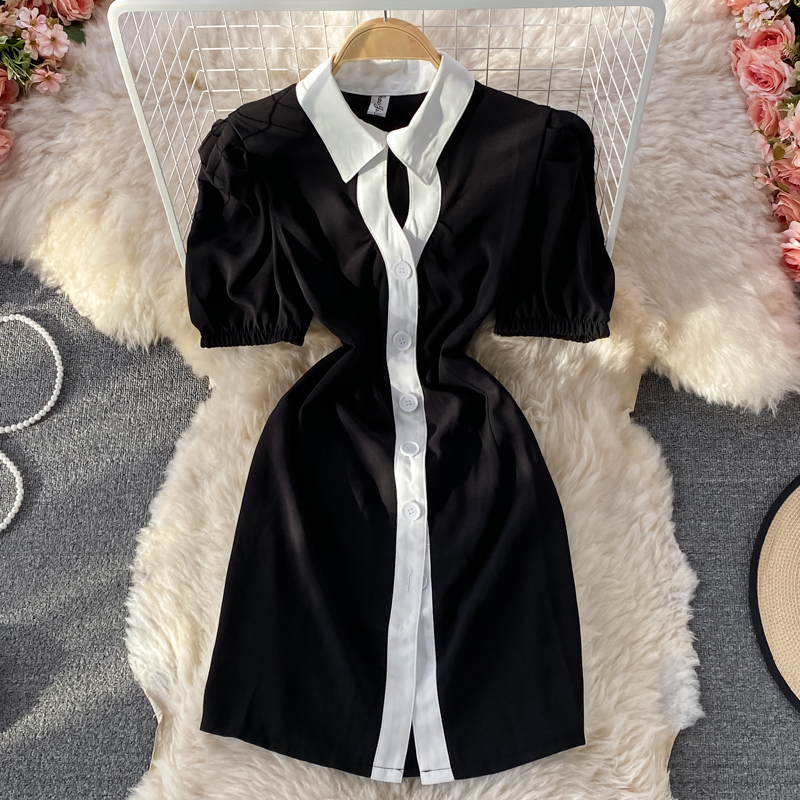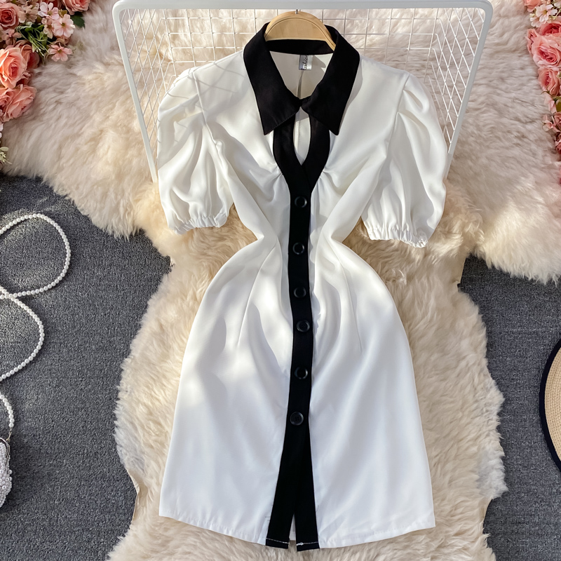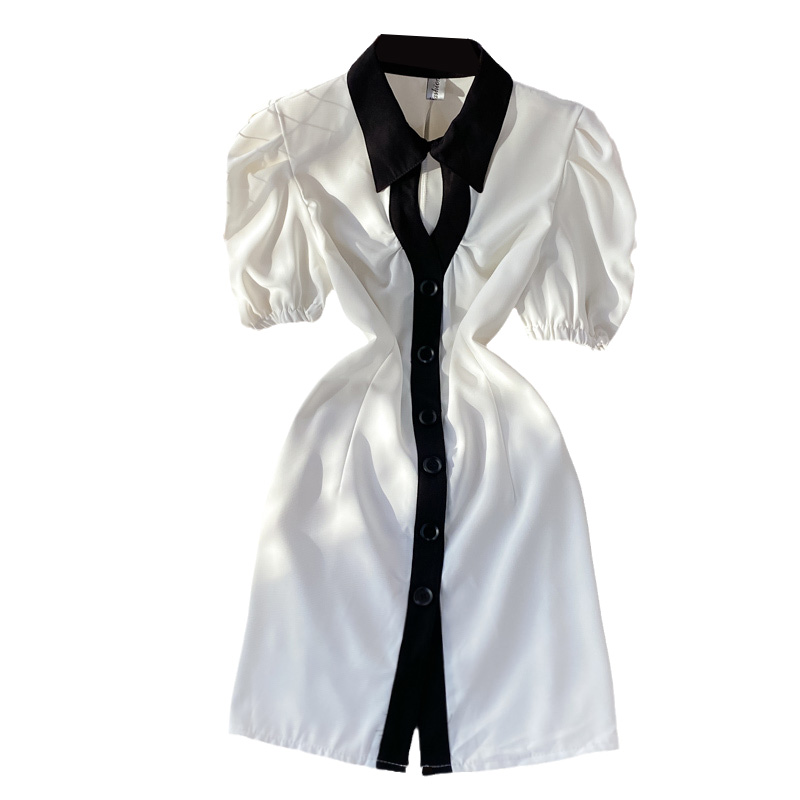 Hepburn Gentle French Style Retro First Love Dress Summer New Puff Sleeve Lapel Contrasting-Color Dress Short Sleeve