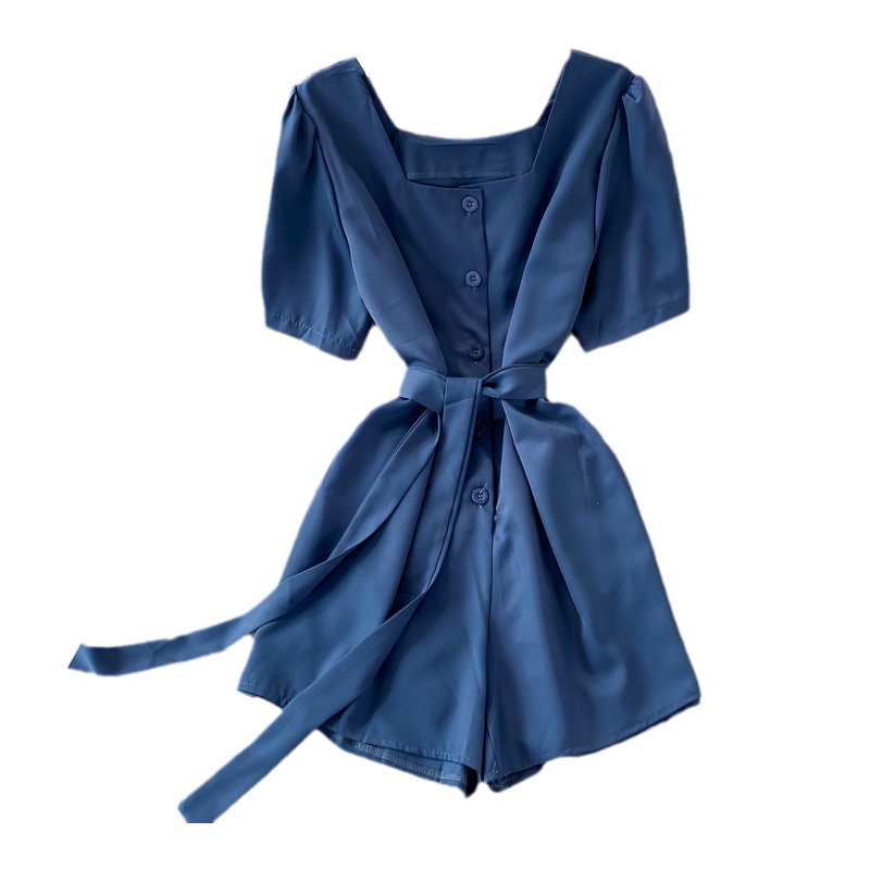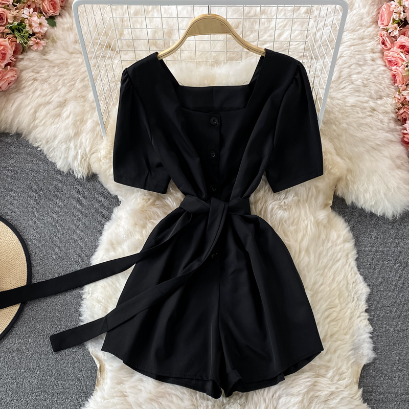 Korean style temperament square neck puff sleeve lace-up waist wide-leg jumpsuit women straight shorts small high waist