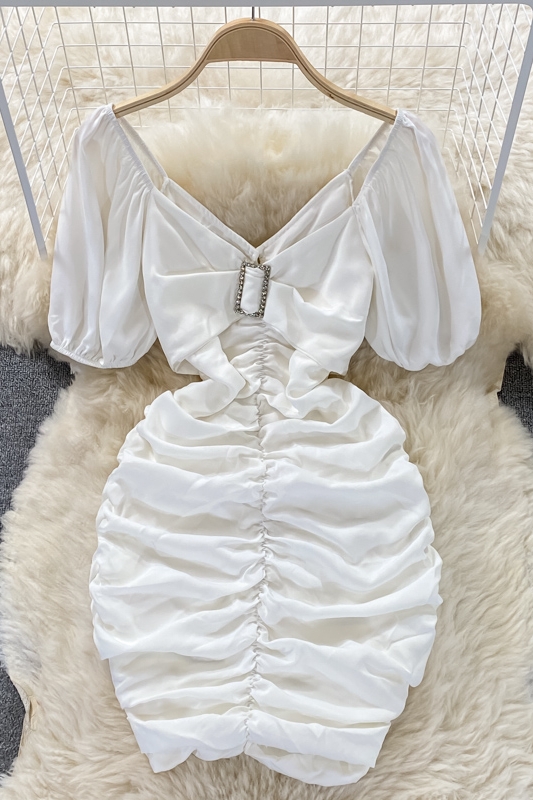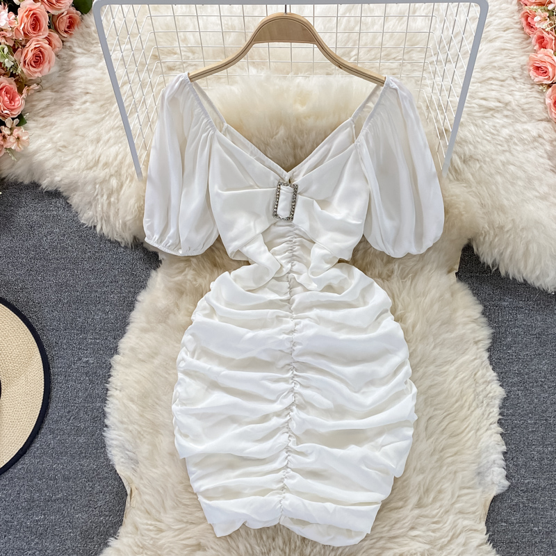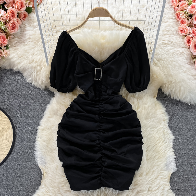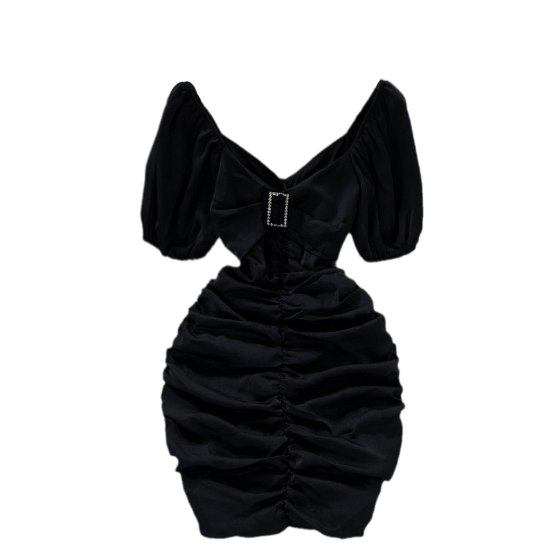 Sexy Cutout Ladies V-neck Slim Fit Slimming Short Hip Skirt Western Style Square Collar Ddiamante Buckle Waist Dress Summer