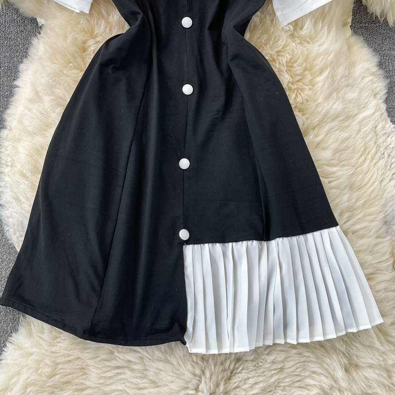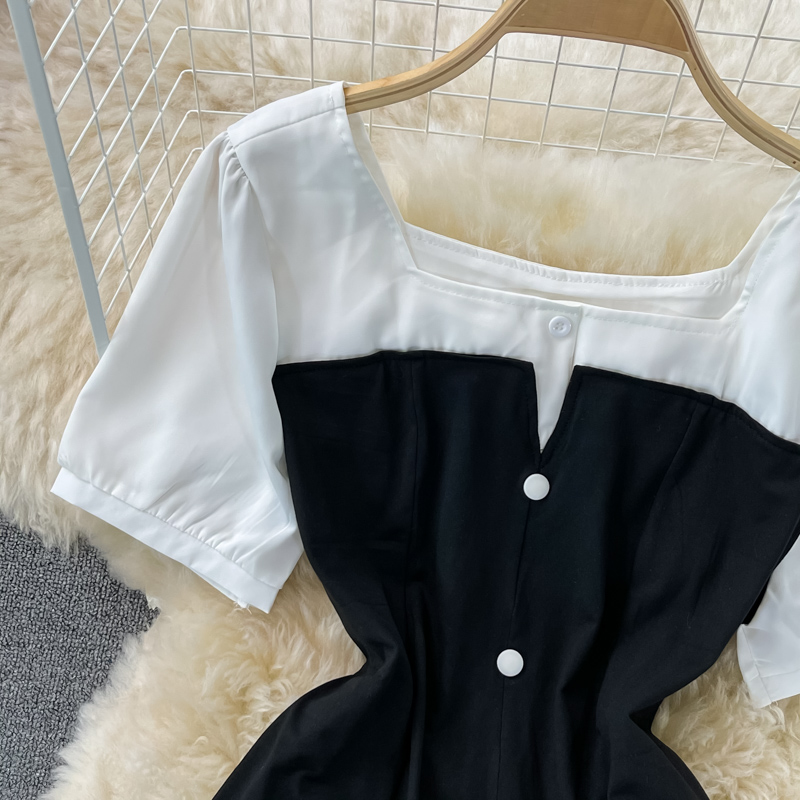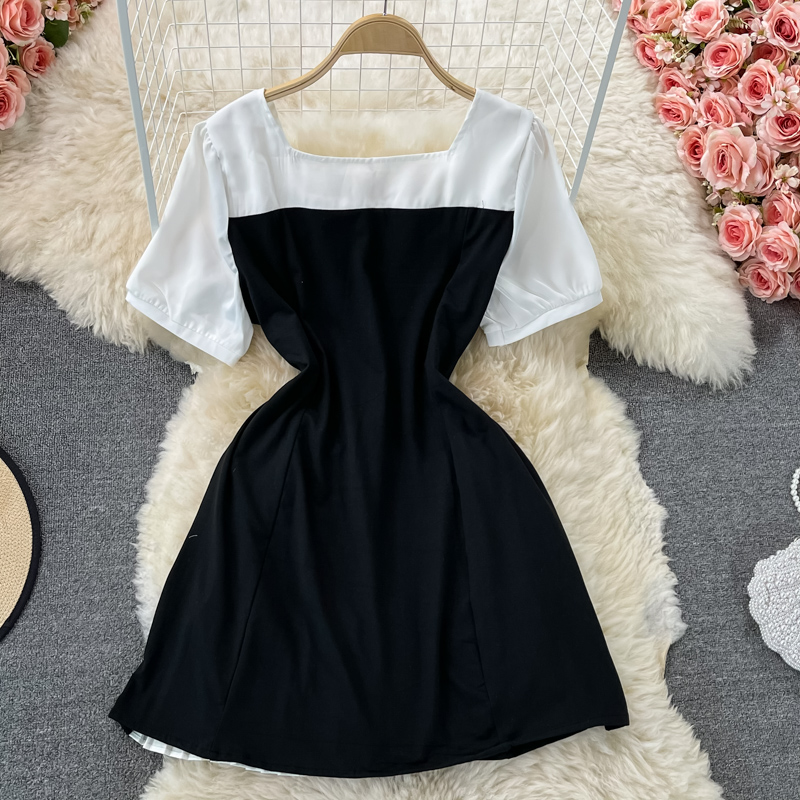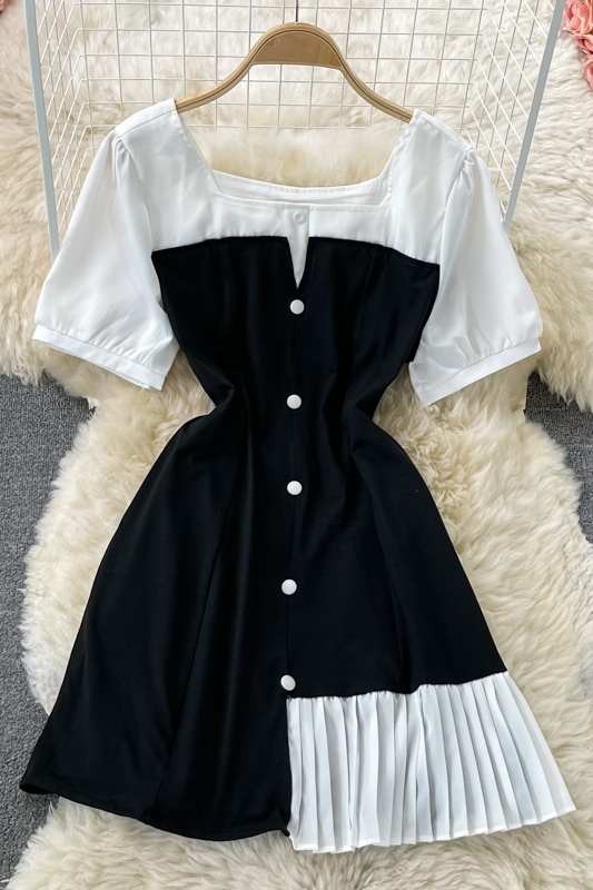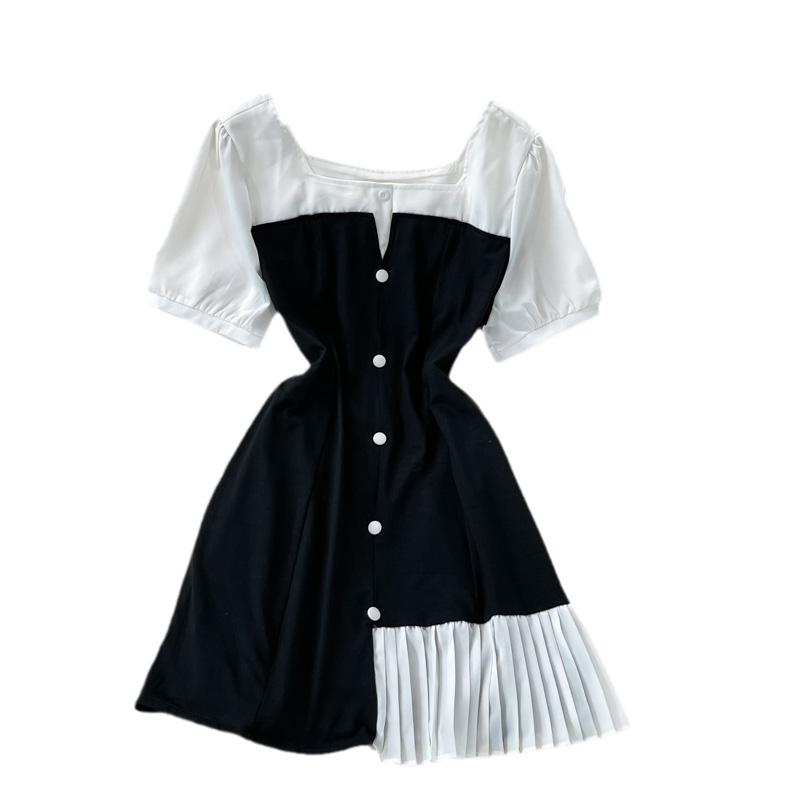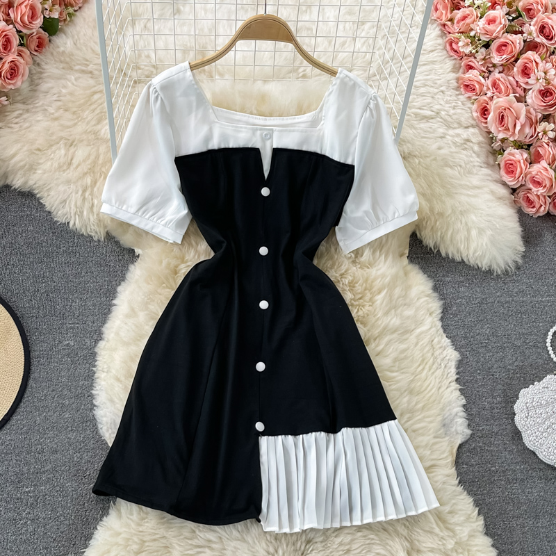 Summer New Elegant French Style Square Collar Puff Sleeve Patchwork Retro Contrast Color Irregular Pleated Dress for Women