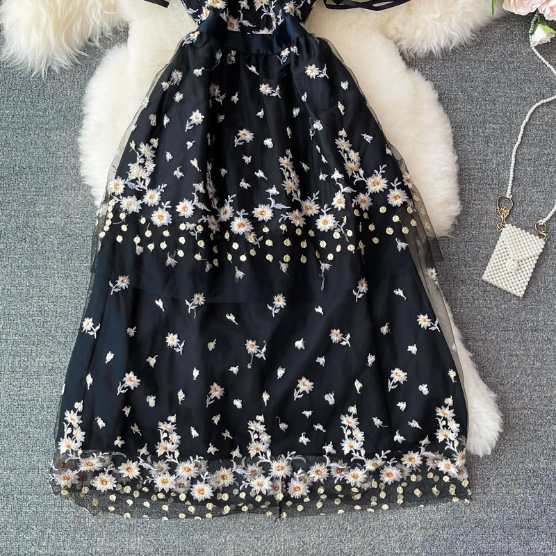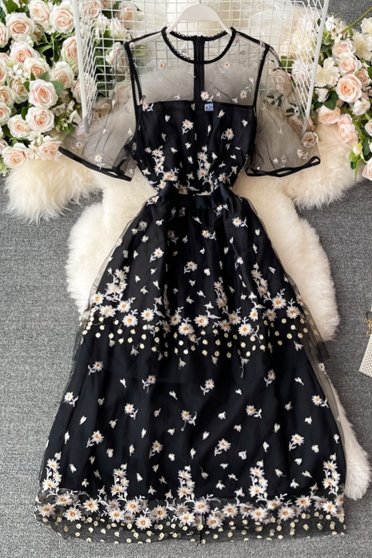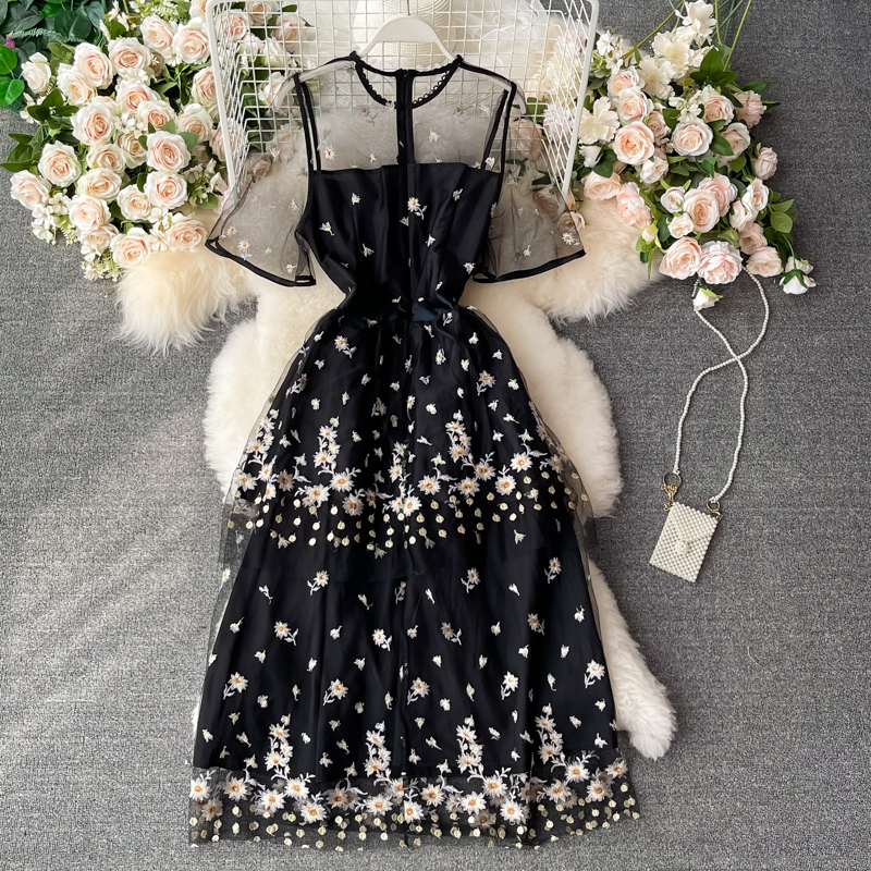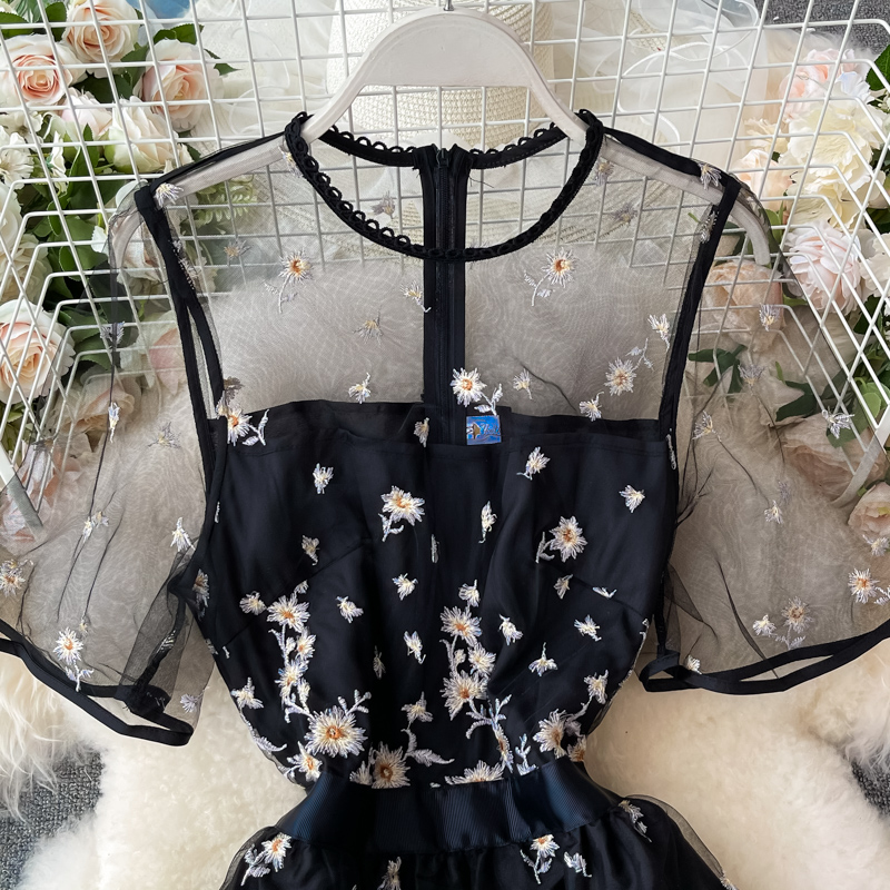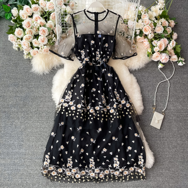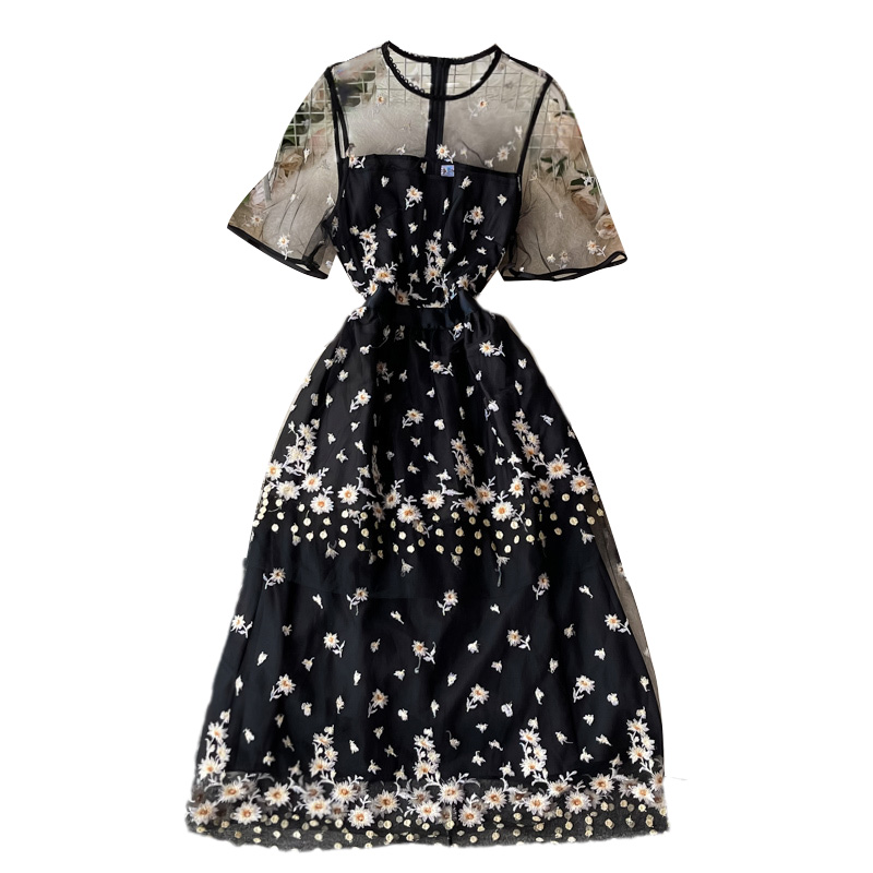 Summer New round Neck See-through Mesh Cinched Embroidery Flower Dress Short Sleeve Elegant Graceful Long Expansion Skirt