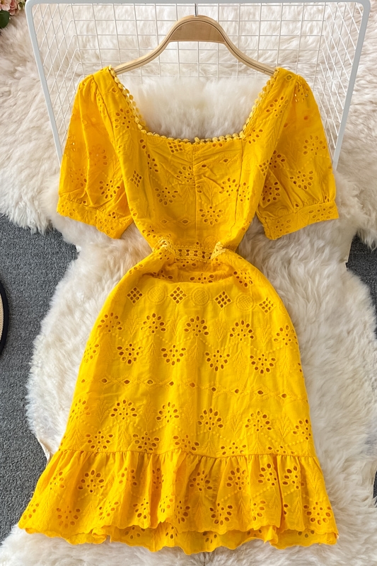 Summer New Square Collar Puff Sleeve Hollow Crocheted Ruffled Waist Slim Fit Temperament Sheath Dress Short Sleeve