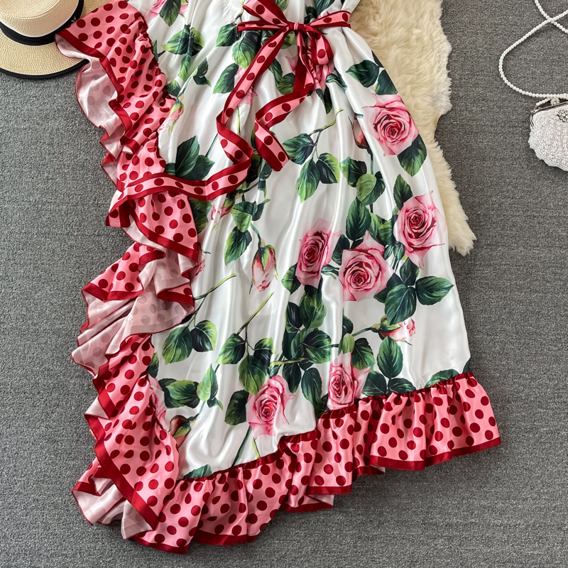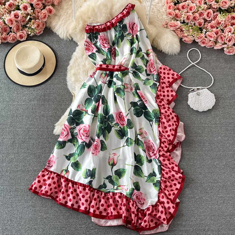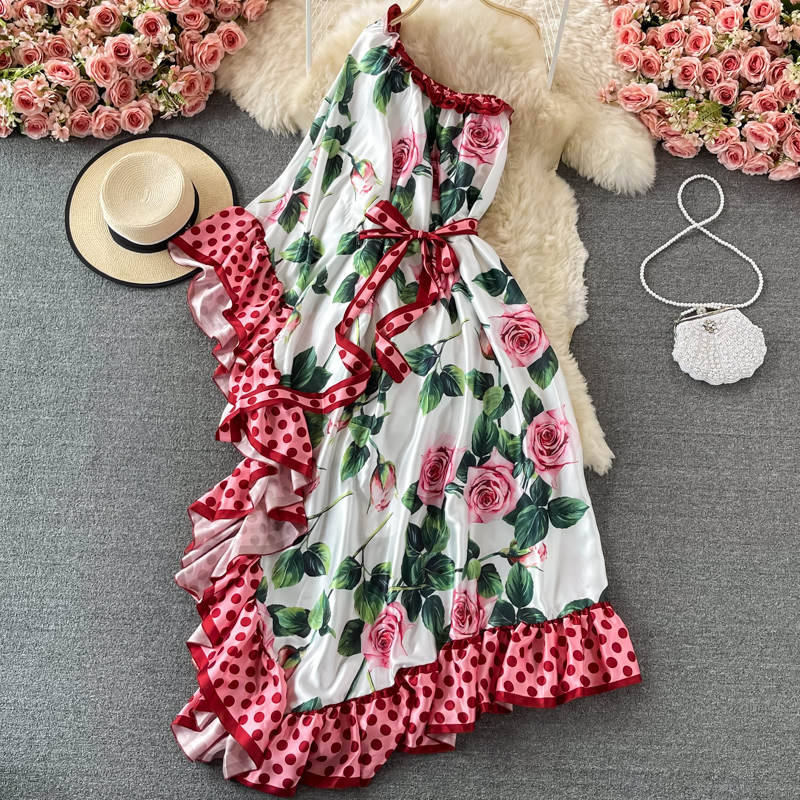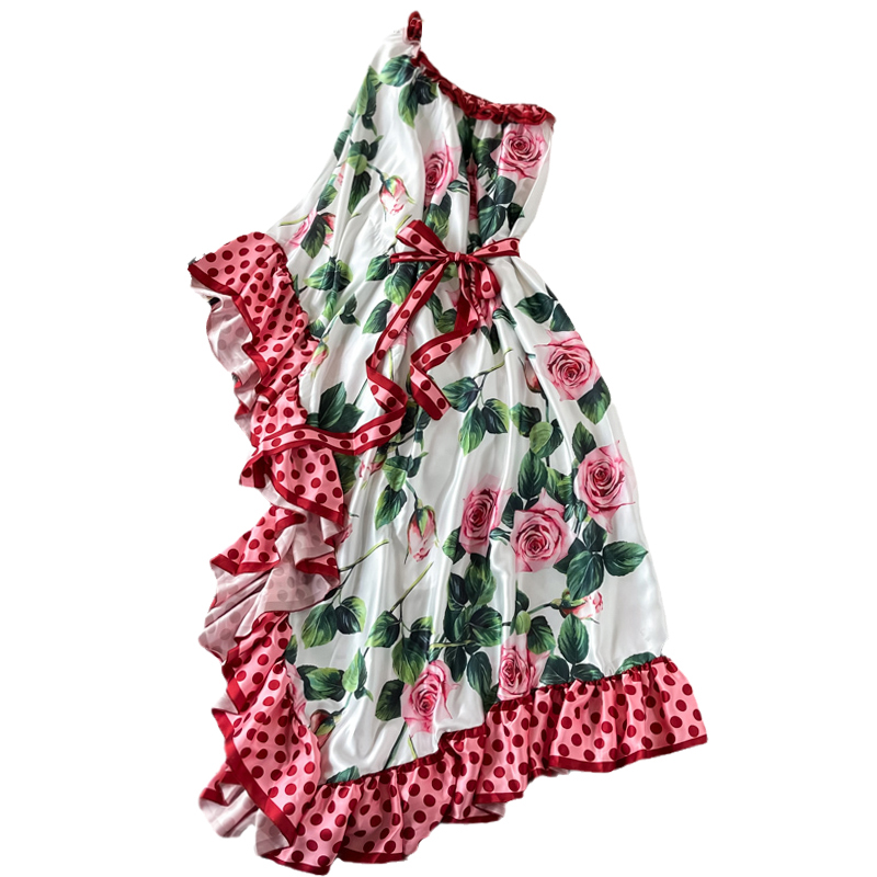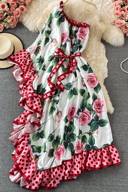 Personalized Ruffled Sloping Shoulder Backless Dress Loose Slim Fit Slimming Bohemian Seaside Holiday Large Swing Dress