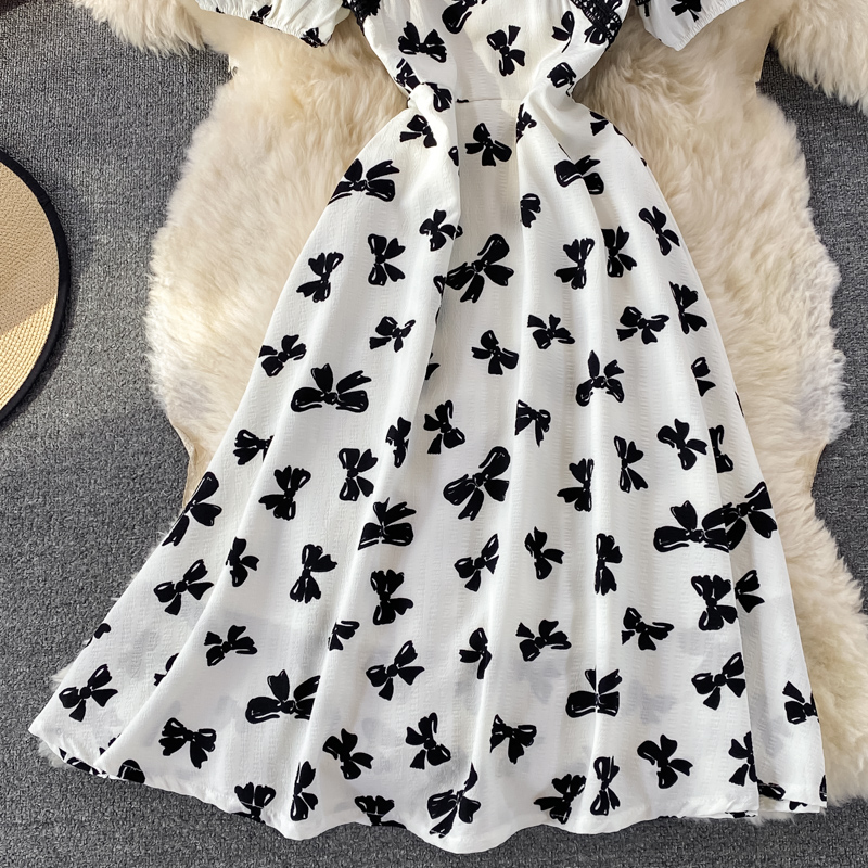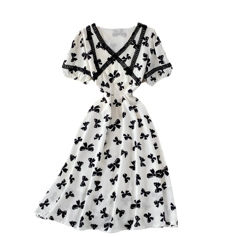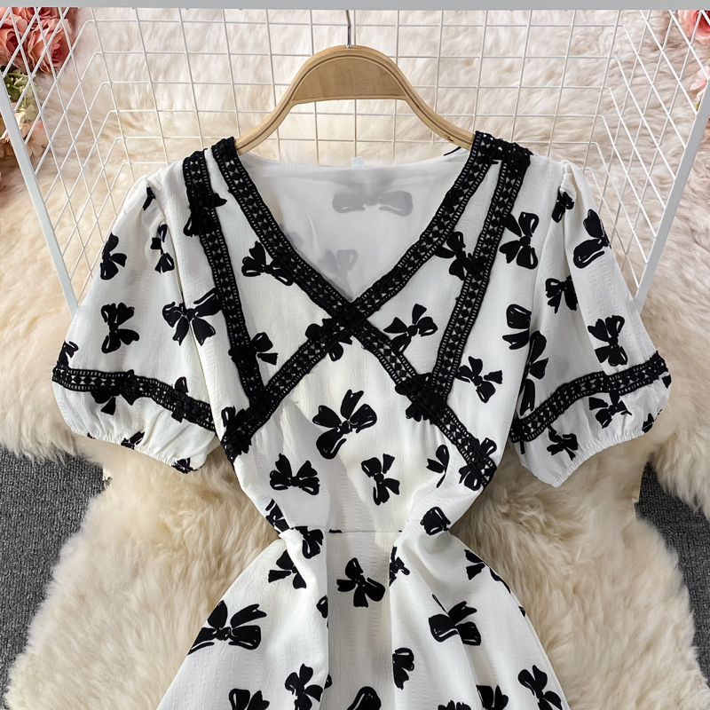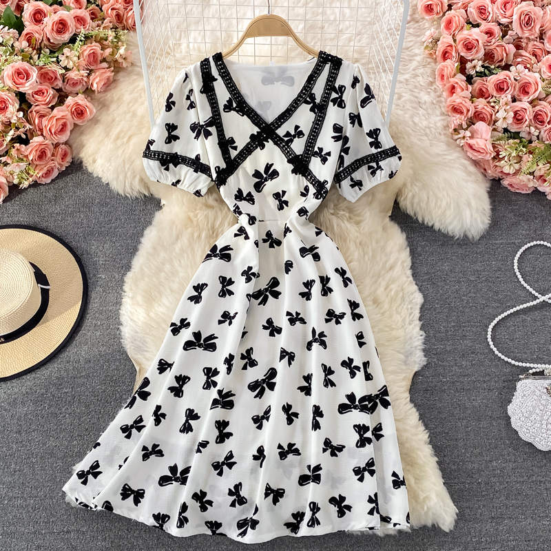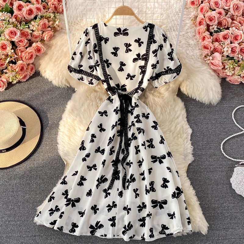 Cheap Dresses, Buy Quality Women’s Clothing Directly from China Suppliers:French First Love Sweet Dress Female Summer Bow Printed V neck Waist Temperament Midi Skirt Short Sleeve