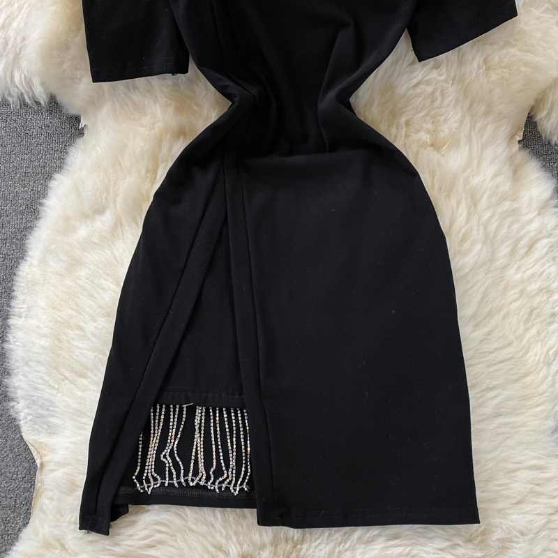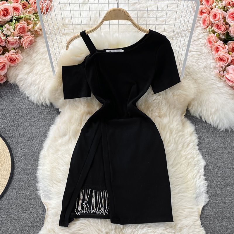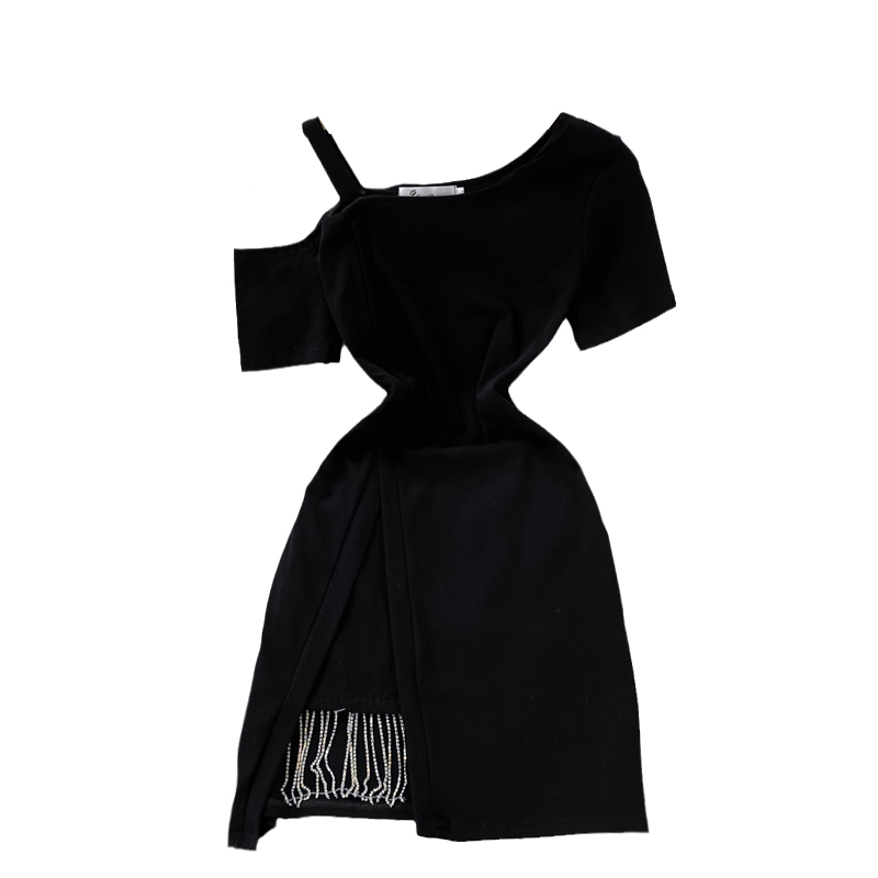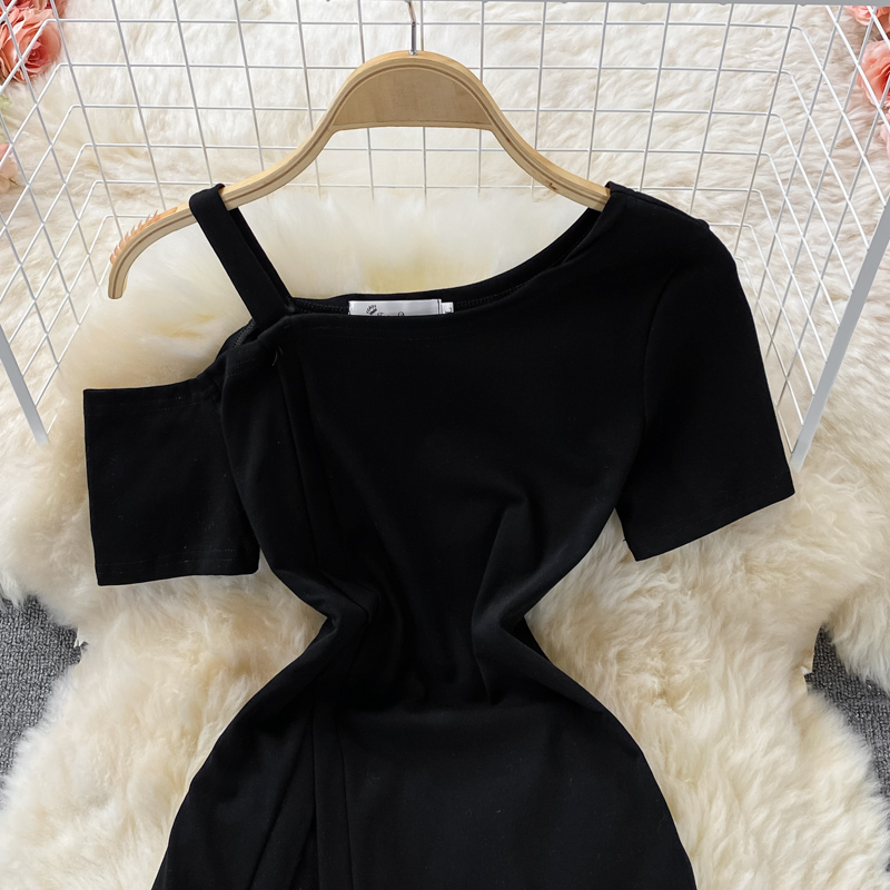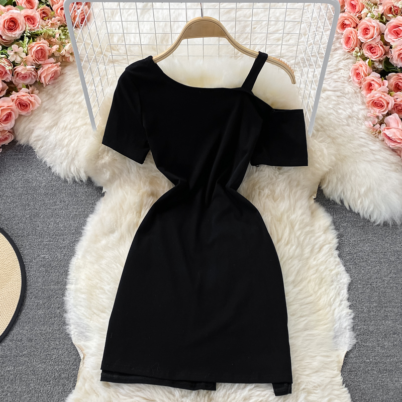 The little man Yujie oblique collar off-shoulder sling short-sleeved irregular temperament Su dress