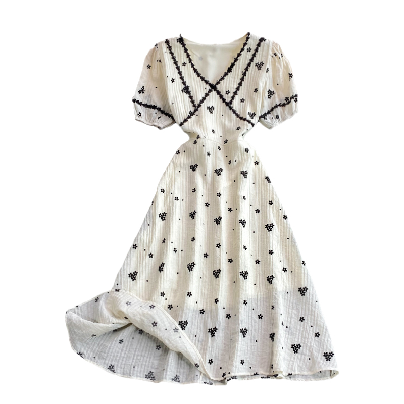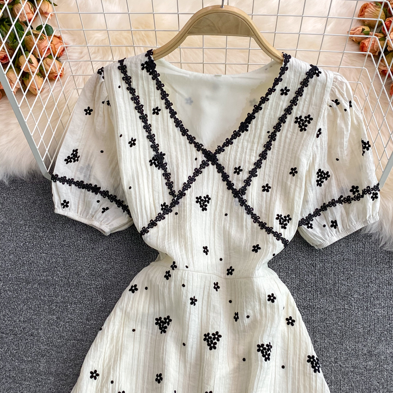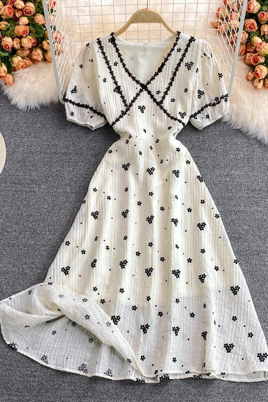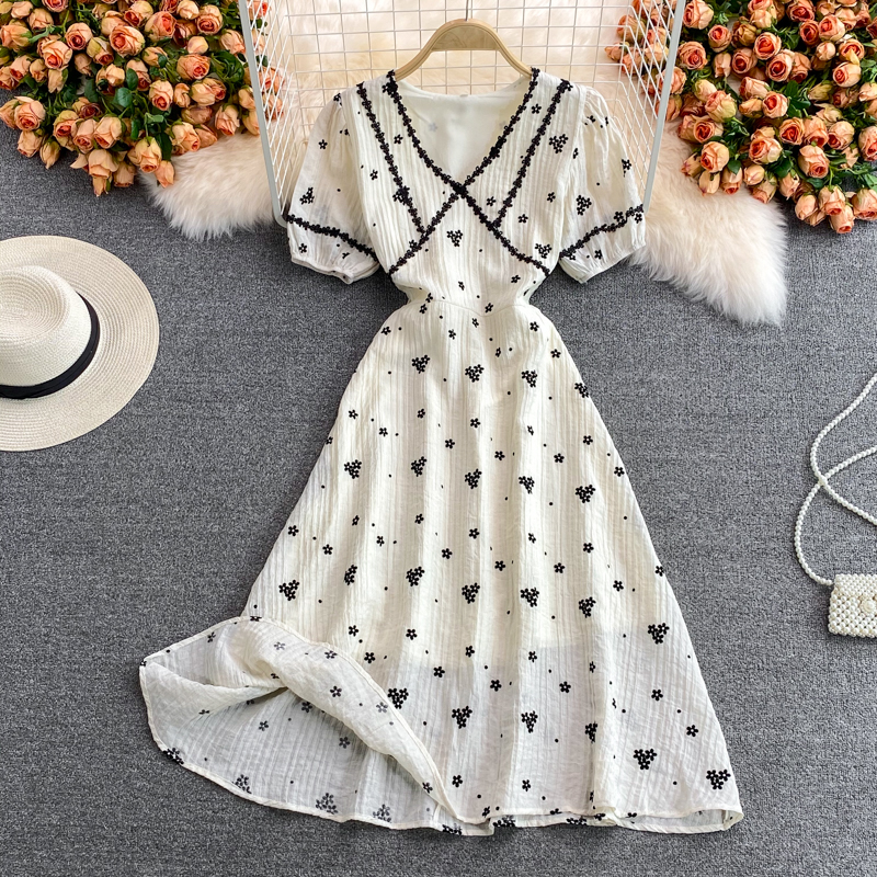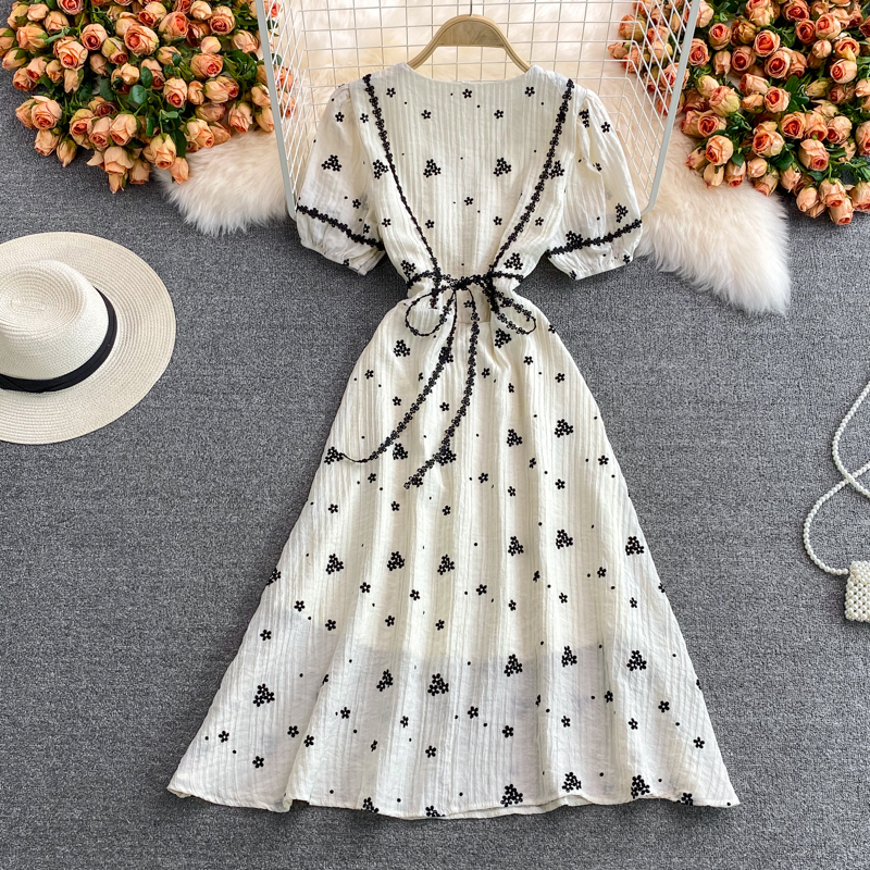 Cheap Dresses, Buy Quality Women’s Clothing Directly from China Suppliers:Lightly Mature Floral Dress Women’s Summer French First Love Tea Break Skirt Gentle Temperament White V Collar Dress