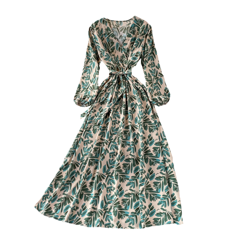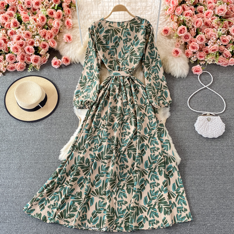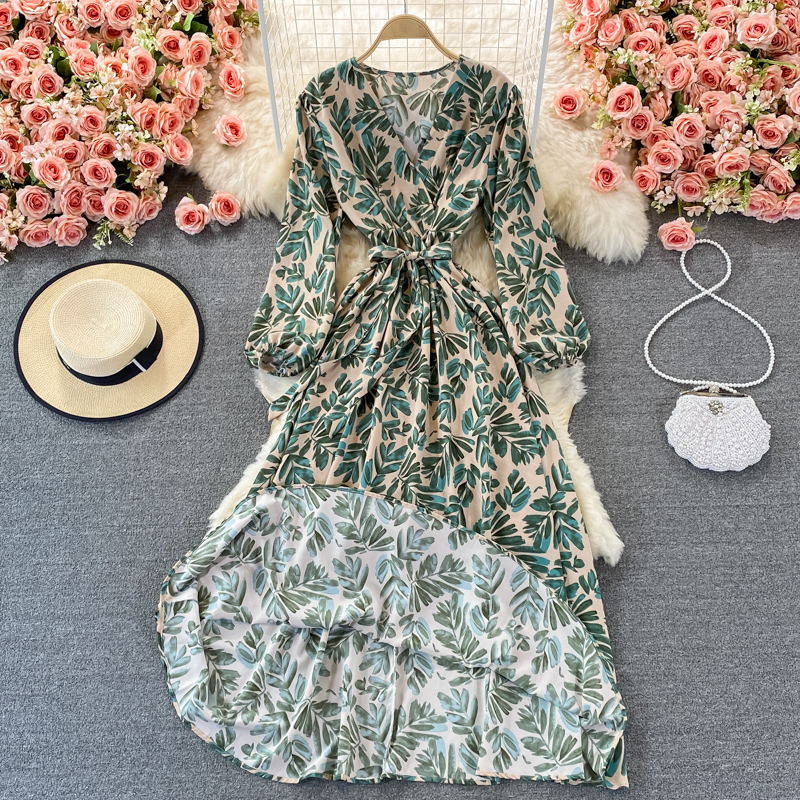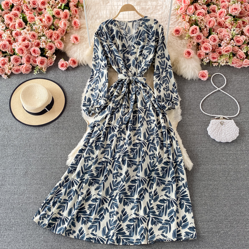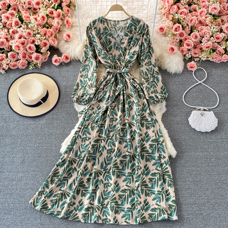 Cheap Dresses, Buy Quality Women’s Clothing Directly from China Suppliers:Lightly Mature Printed V neck Dress Summer Gentle Graceful Puff Sleeve Tight Waist Super Fairy Swing Dress
