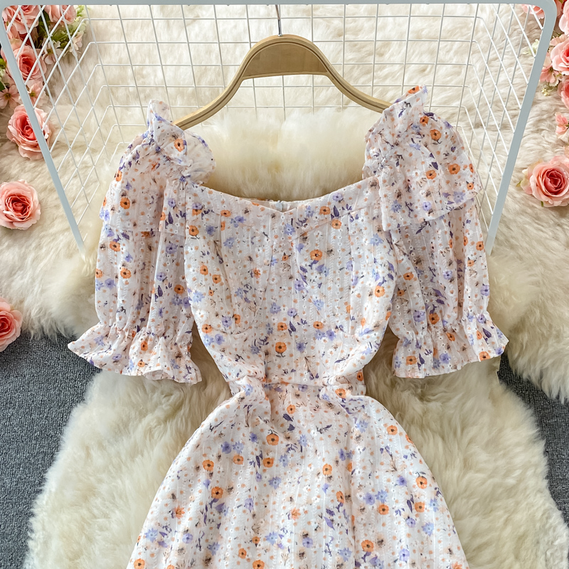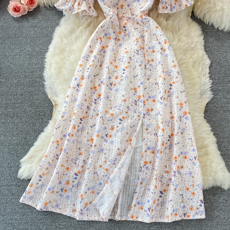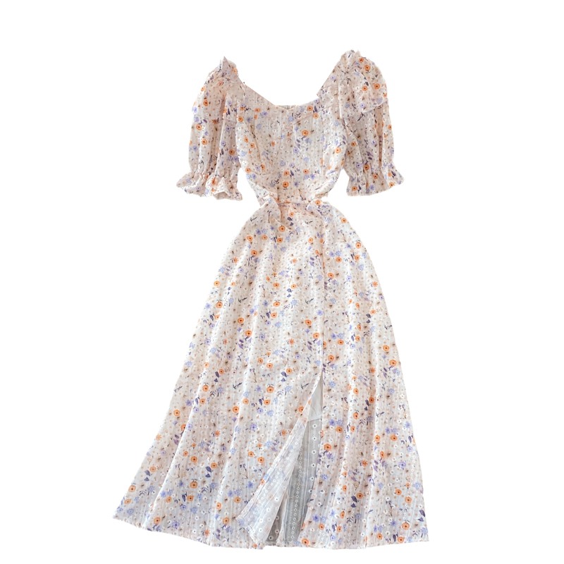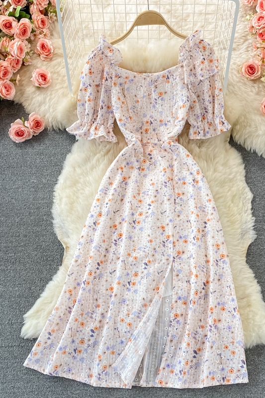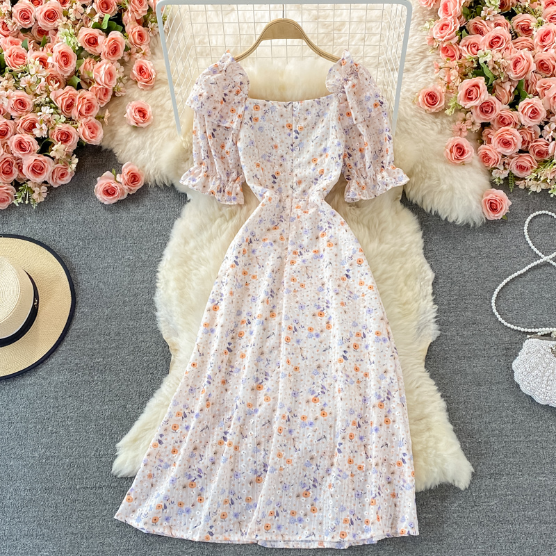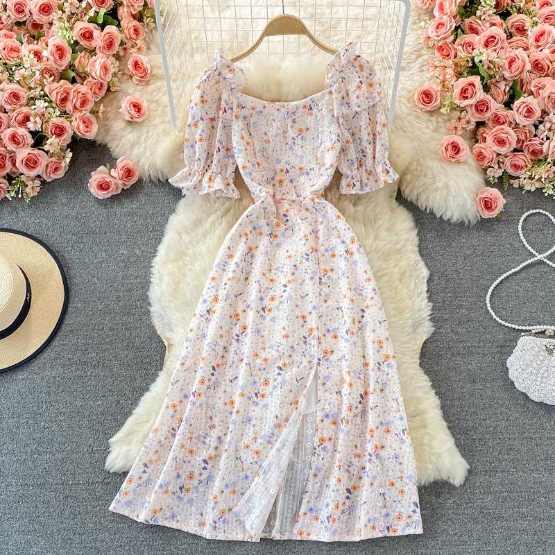 Summer New French Style Temperament Square Collar Mid-Length Tight Waist Bubble Sleeve Split Floral Chiffon Dress for Women