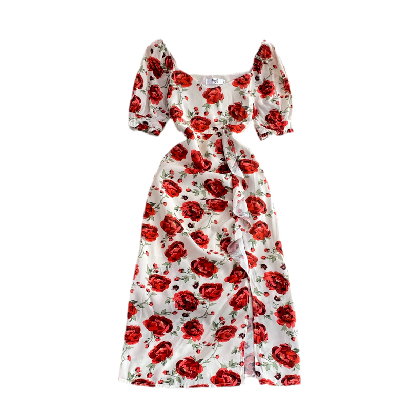 French Style Retro Kikyo Tea Dress Rose Dress Tight Waist Slimming Elegant Slightly Mature Style Split Floral Dress for Women
