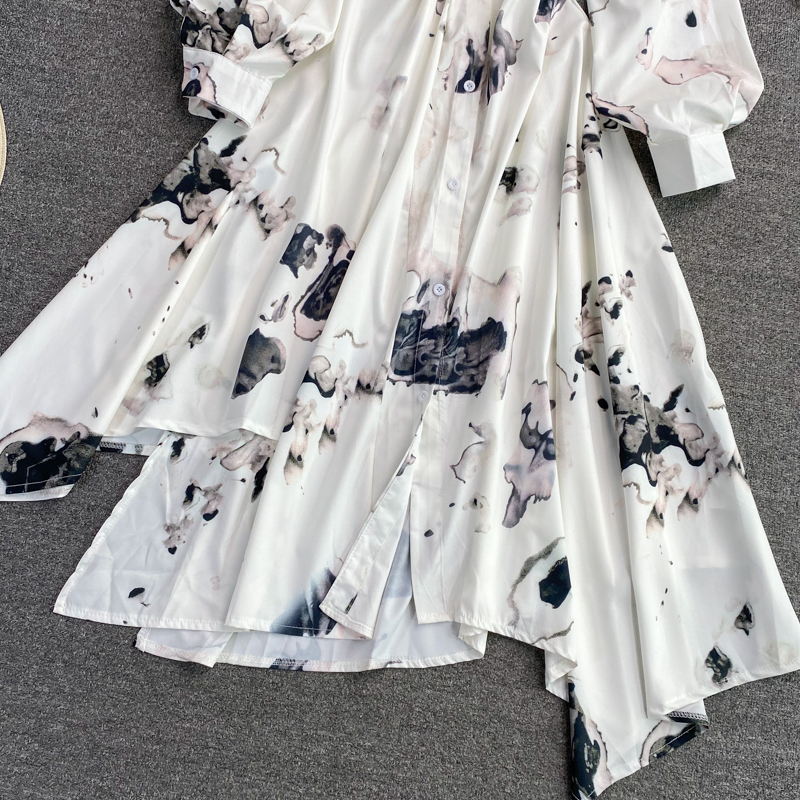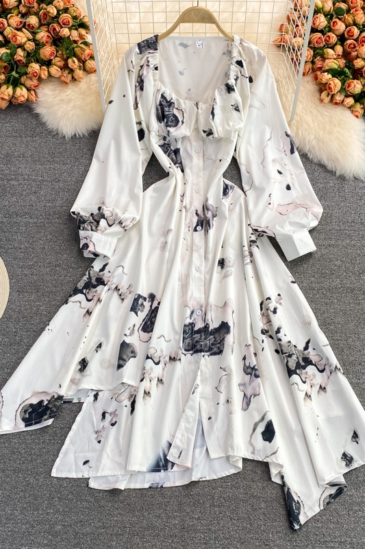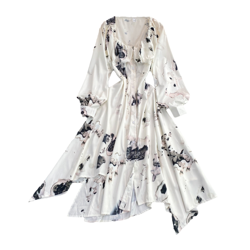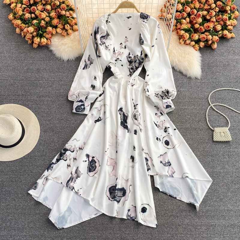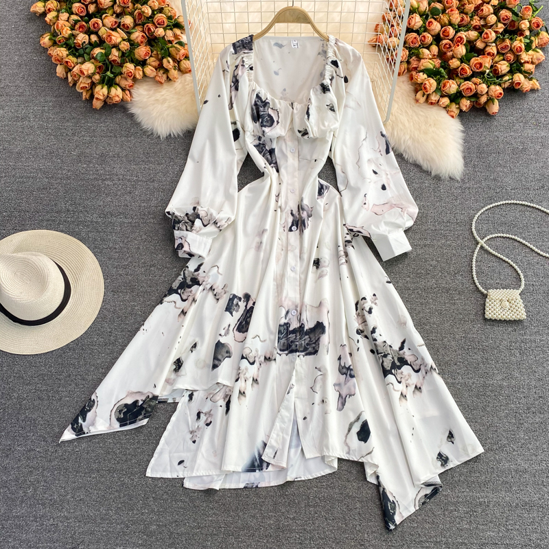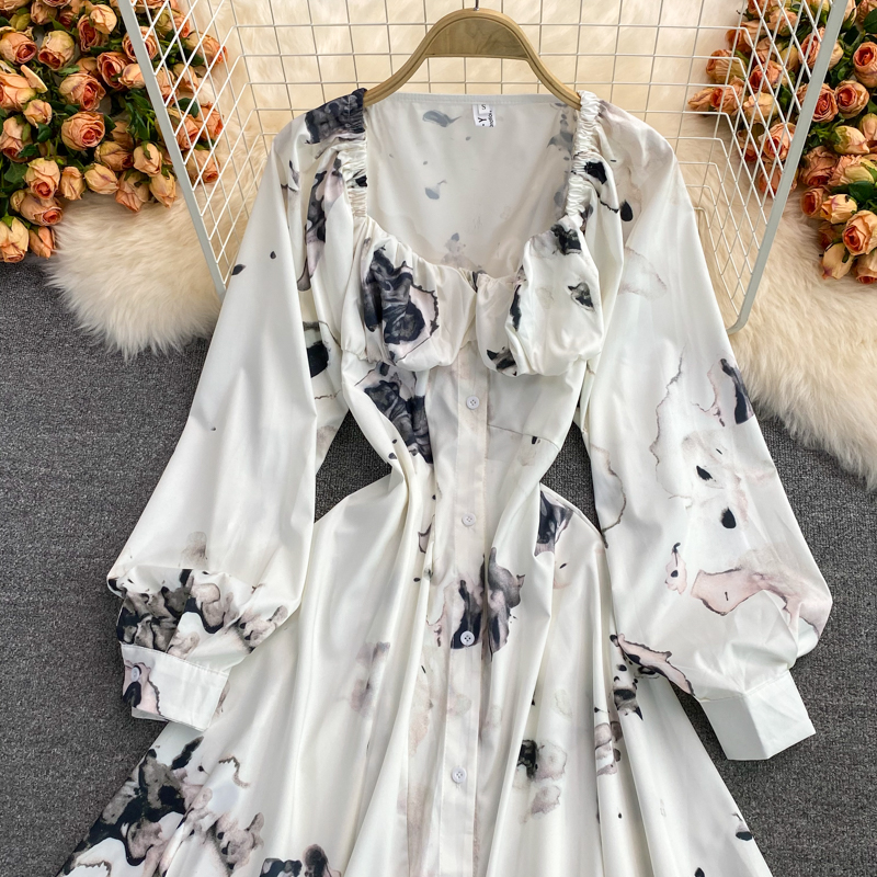 Cheap Dresses, Buy Quality Women’s Clothing Directly from China Suppliers:French ink painting square neck dress autumn new light mature wind irregular temperament long sleeve waist waist dress