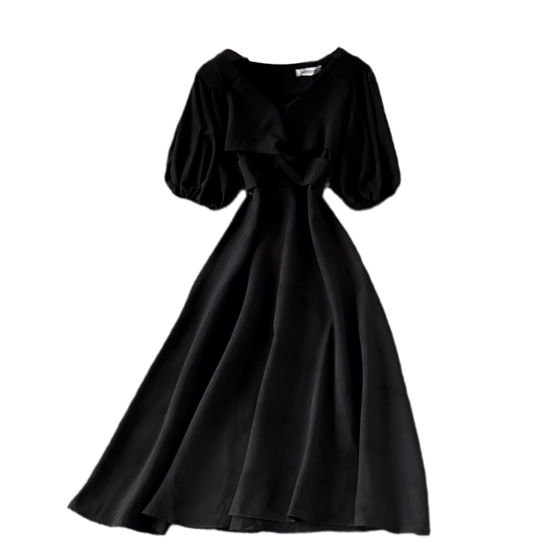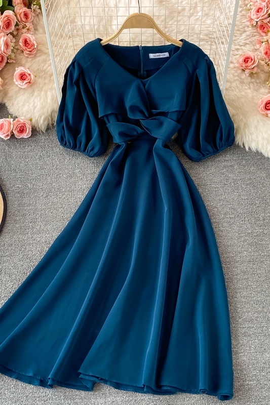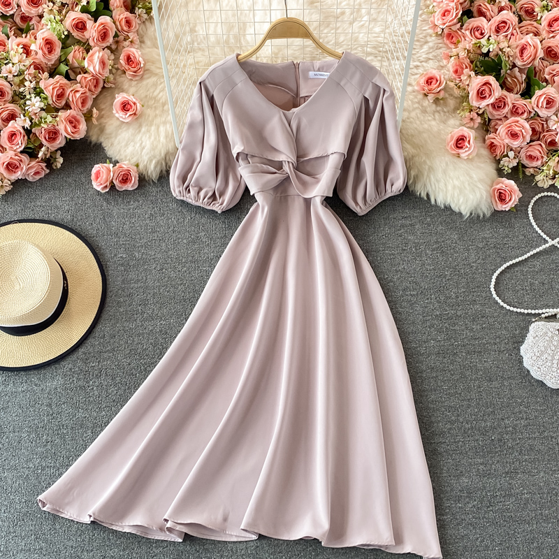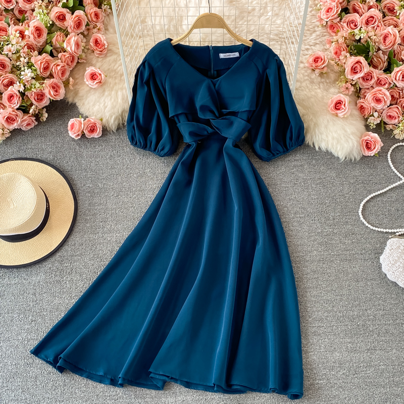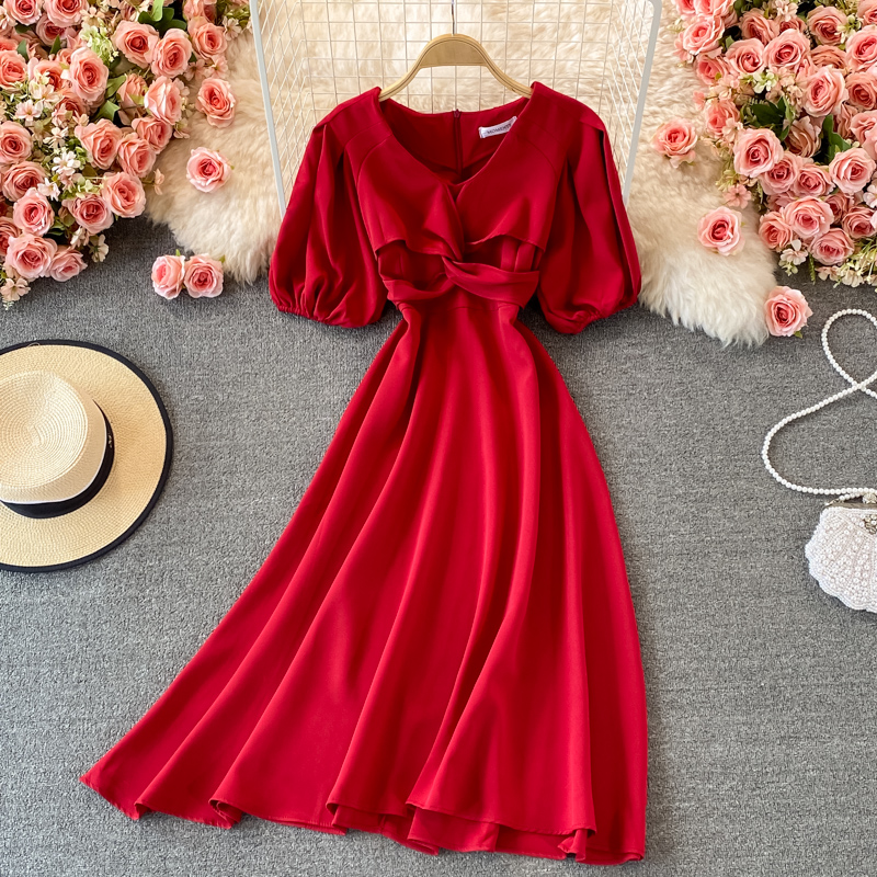 Cheap Dresses, Buy Quality Women’s Clothing Directly from China Suppliers:Hepburn Gentle First Love V neck Dress Female Summer French Waist Slimming Retro Puff Sleeve Temperament Midi Skirt