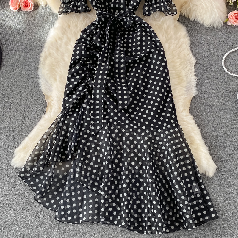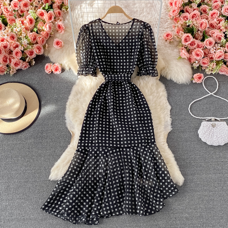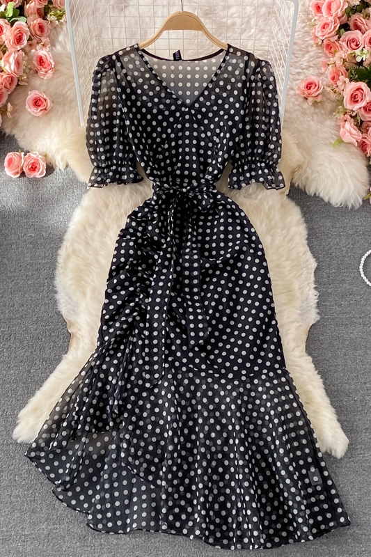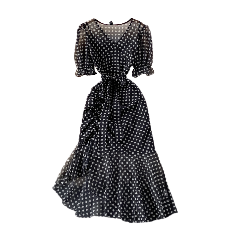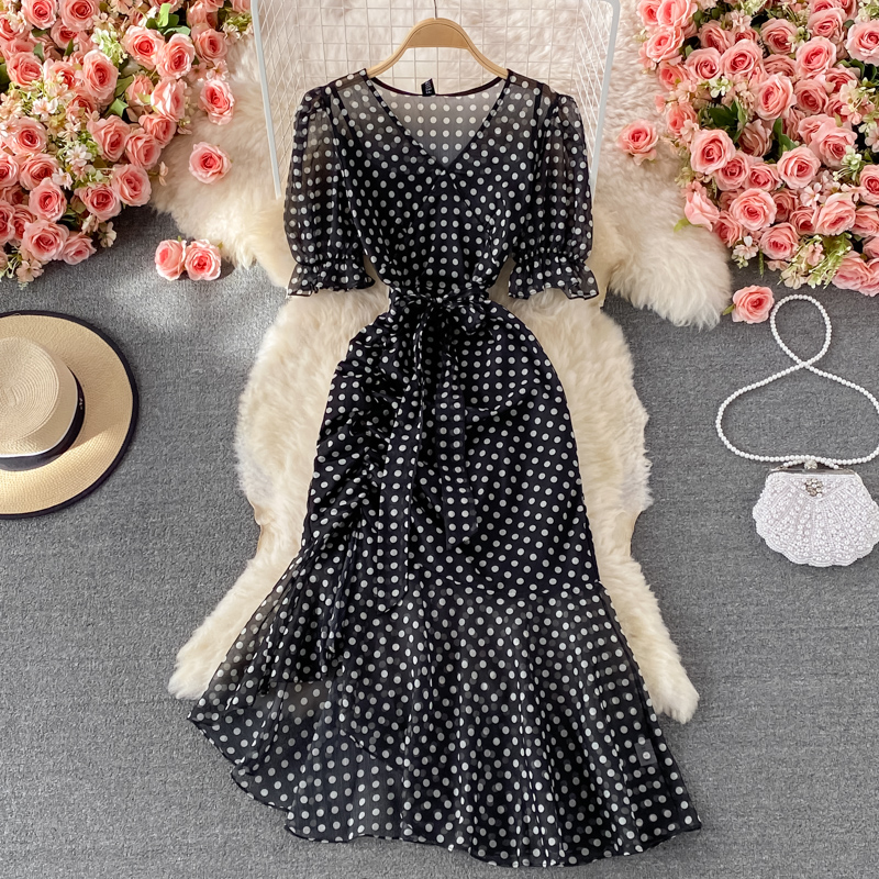 Cheap Dresses, Buy Quality Women’s Clothing Directly from China Suppliers:Summer New Elegant French Tight Waist Slimming Puff Sleeve V Collar Polka Dot Chiffon Dress Sheath Dress