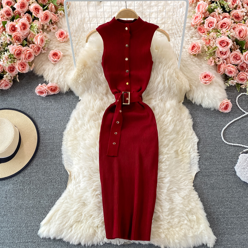 European and American stand-up collar and buckle Slim waist elastic knitting waist thinner mid-length bag hip bottoming skirt