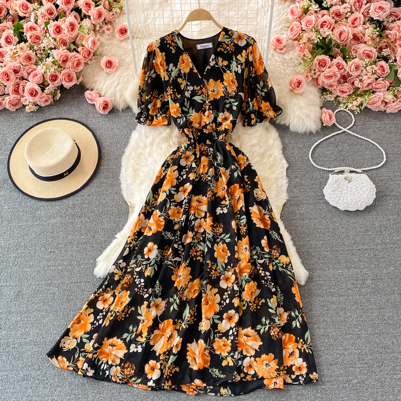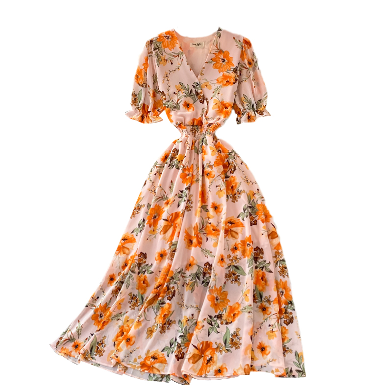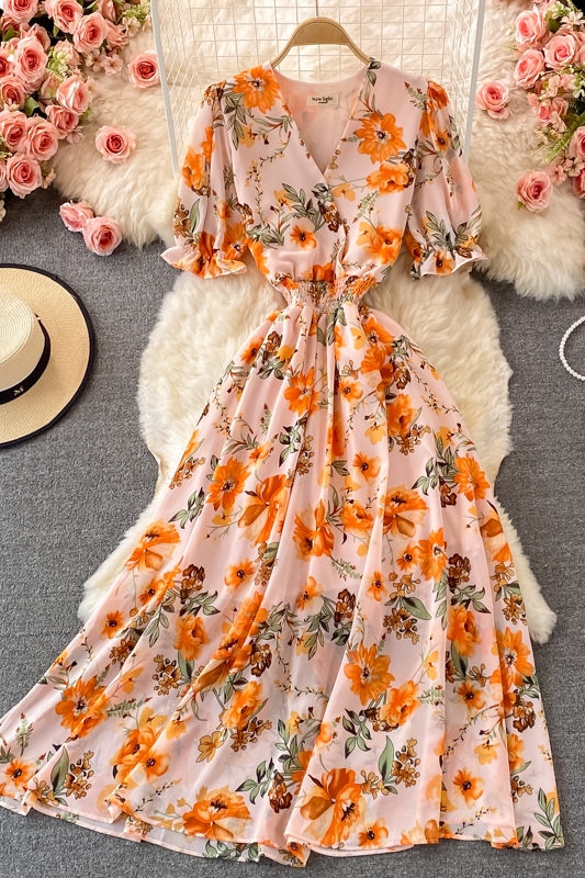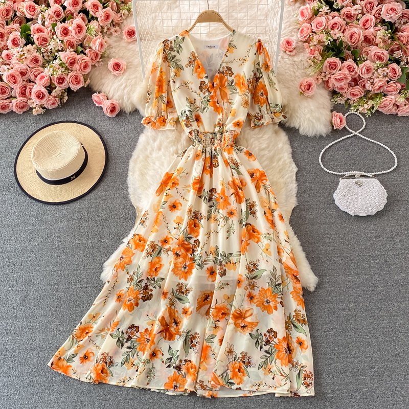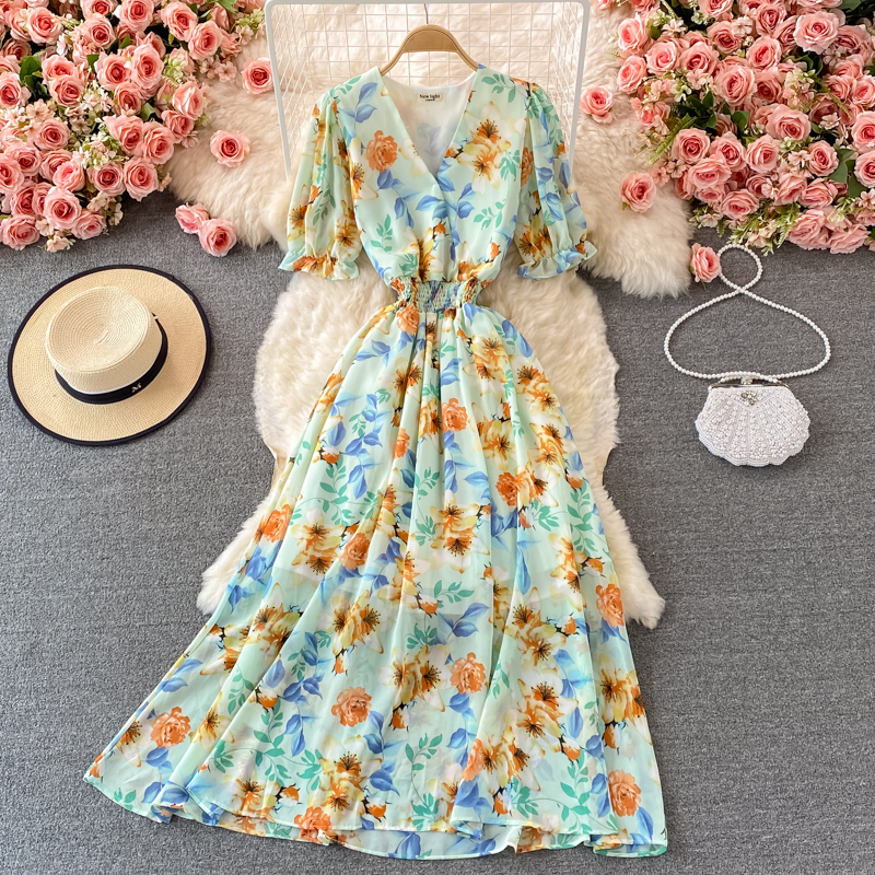 Cheap Dresses, Buy Quality Women’s Clothing Directly from China Suppliers:Summer new waist short sleeved printed V neck chiffon dress over the knee was thin popular puff sleeve large swing dress