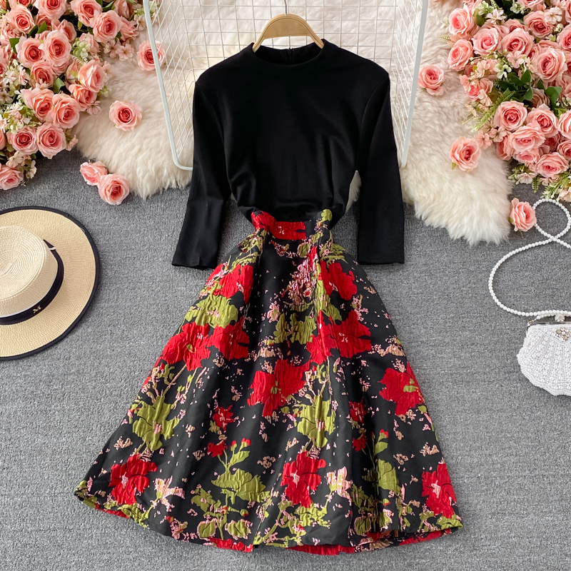 Feminine Dress Women's Autumn New Fashion Stitching Printing Gas Stand-up Collar Cinched Slim-Fit Mid-Length Dress