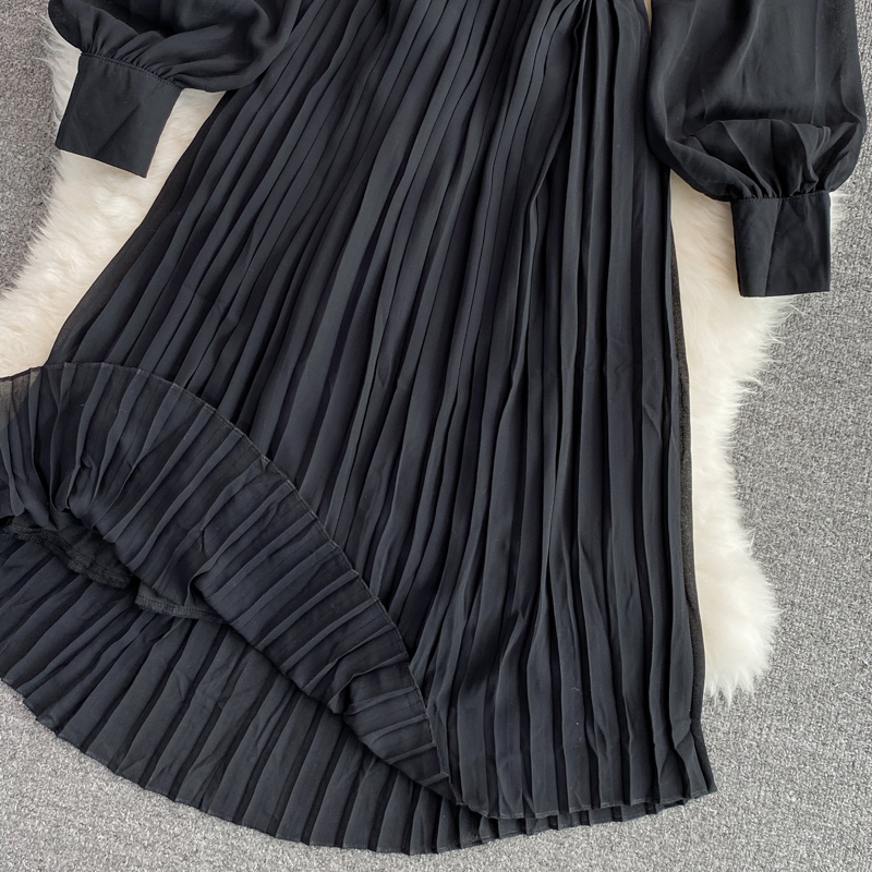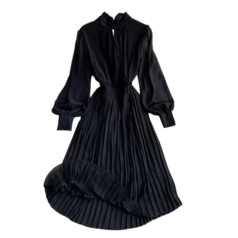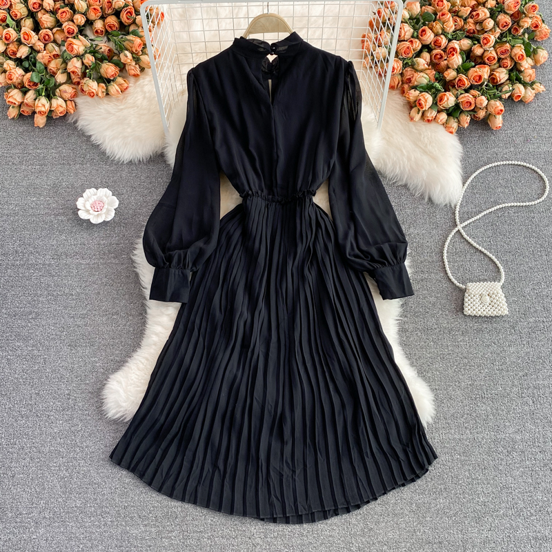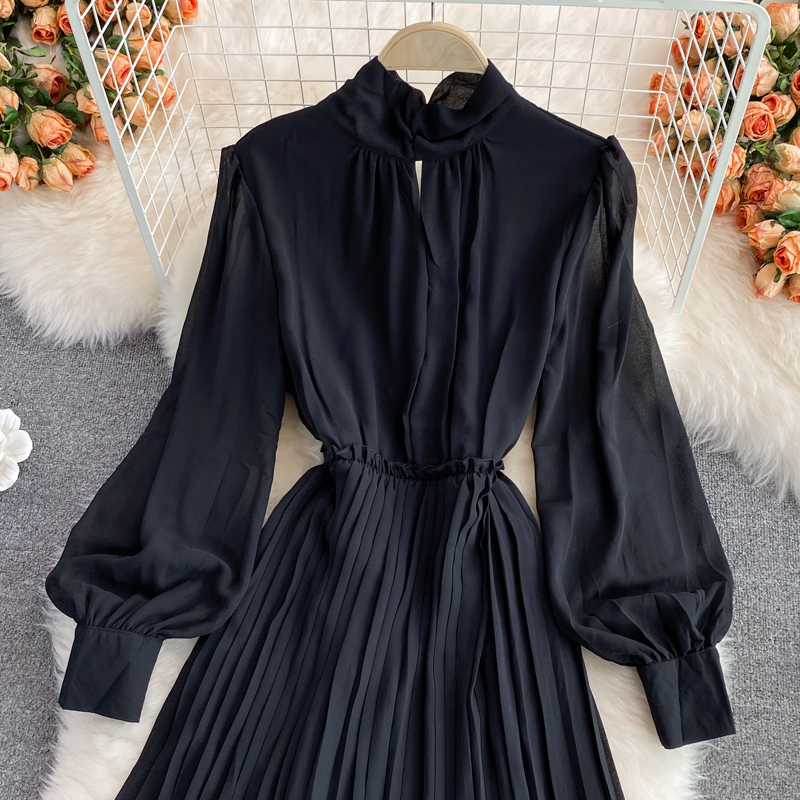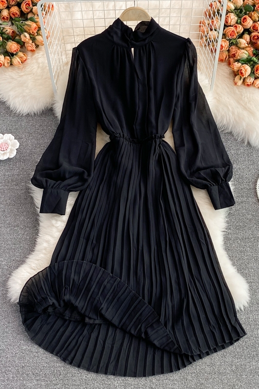 Cheap Dresses, Buy Quality Women’s Clothing Directly from China Suppliers:Autumn New Korean Elegance Lantern Sleeve Stand up Collar Cinched Slimming Mid Length Pleated Dress Long Sleeve