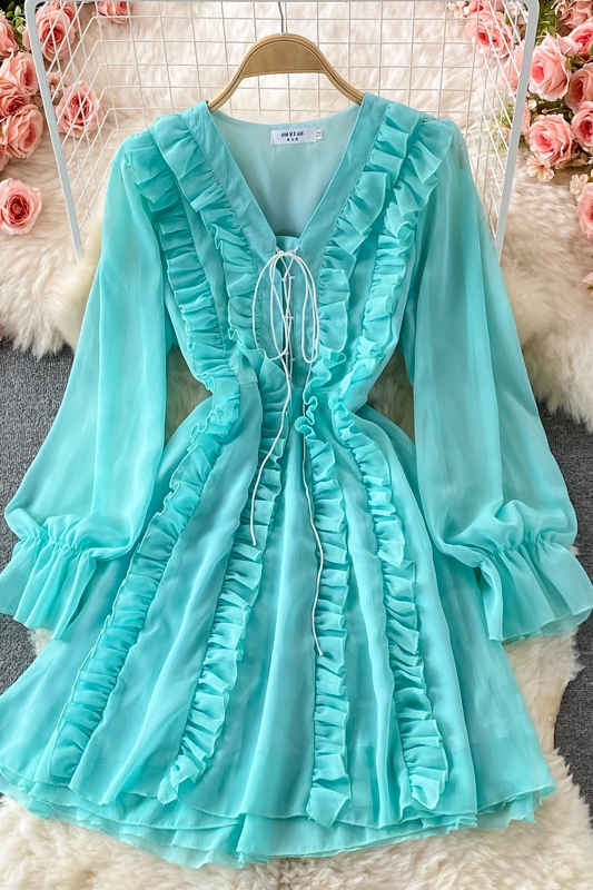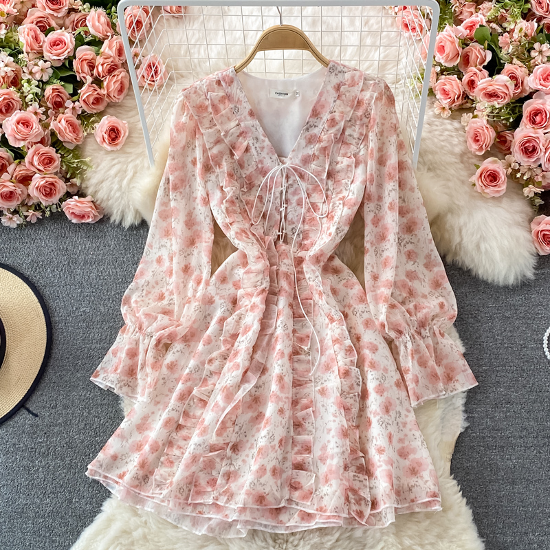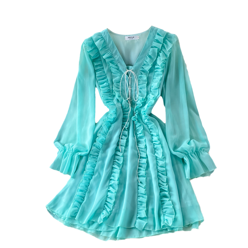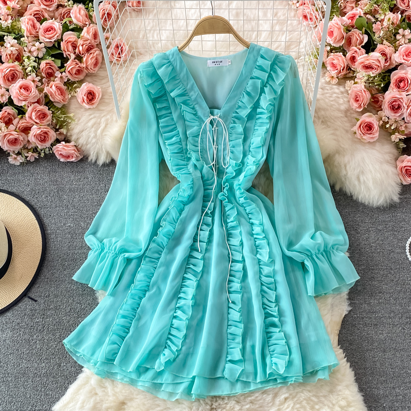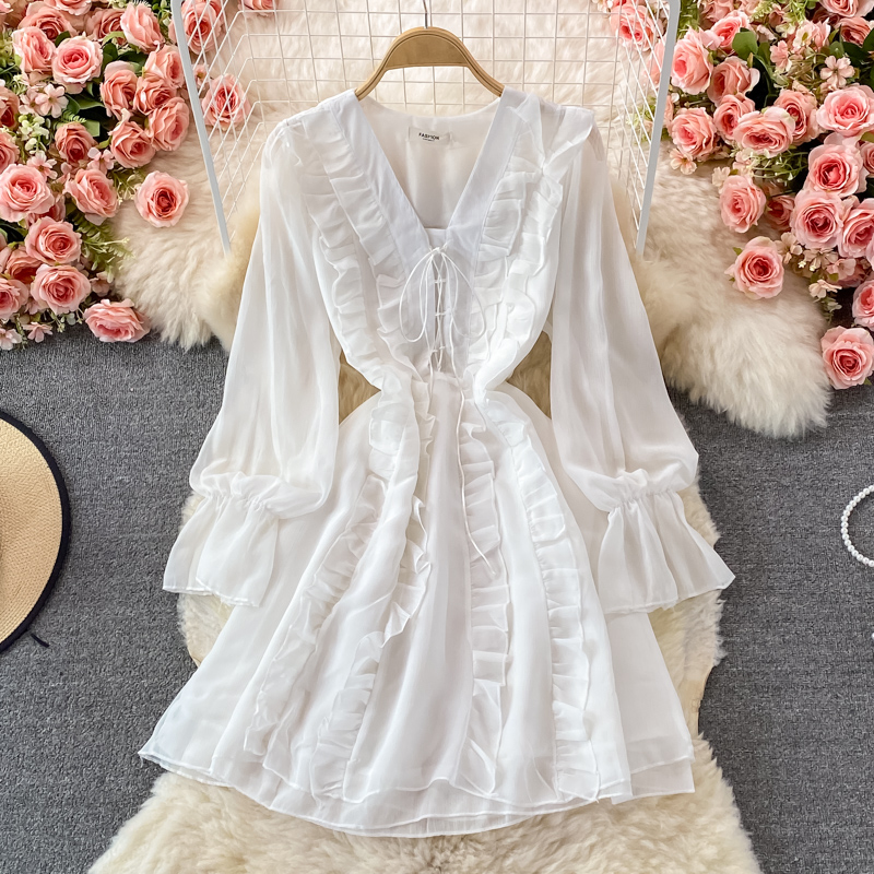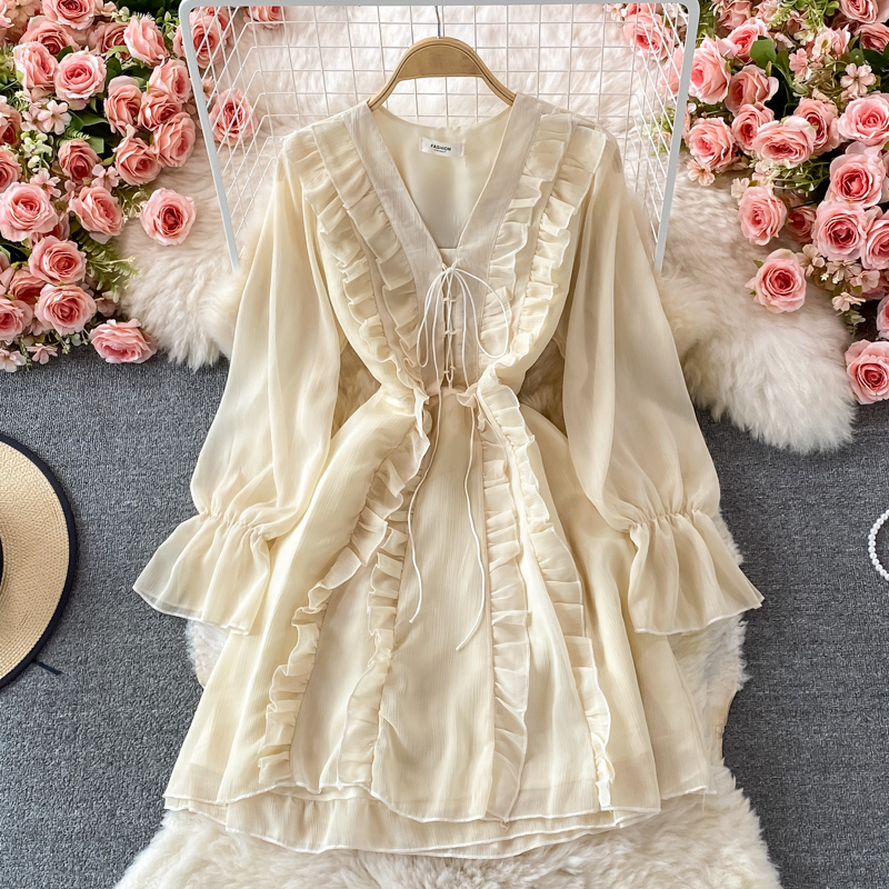 Cheap Dresses, Buy Quality Women’s Clothing Directly from China Suppliers:Long Sleeve Ruffled V neck Dress Autumn New French Style Gentle Fairy Lady Super Fairy Mori Style Mid Length A line Dress
