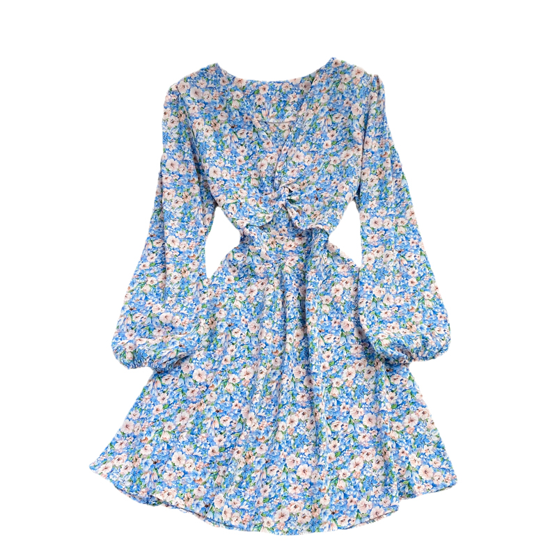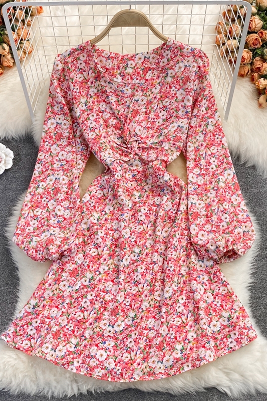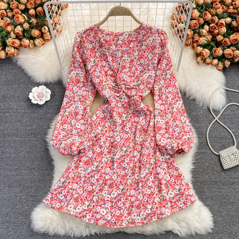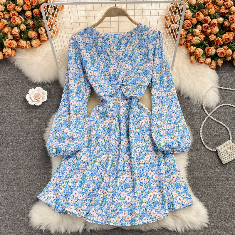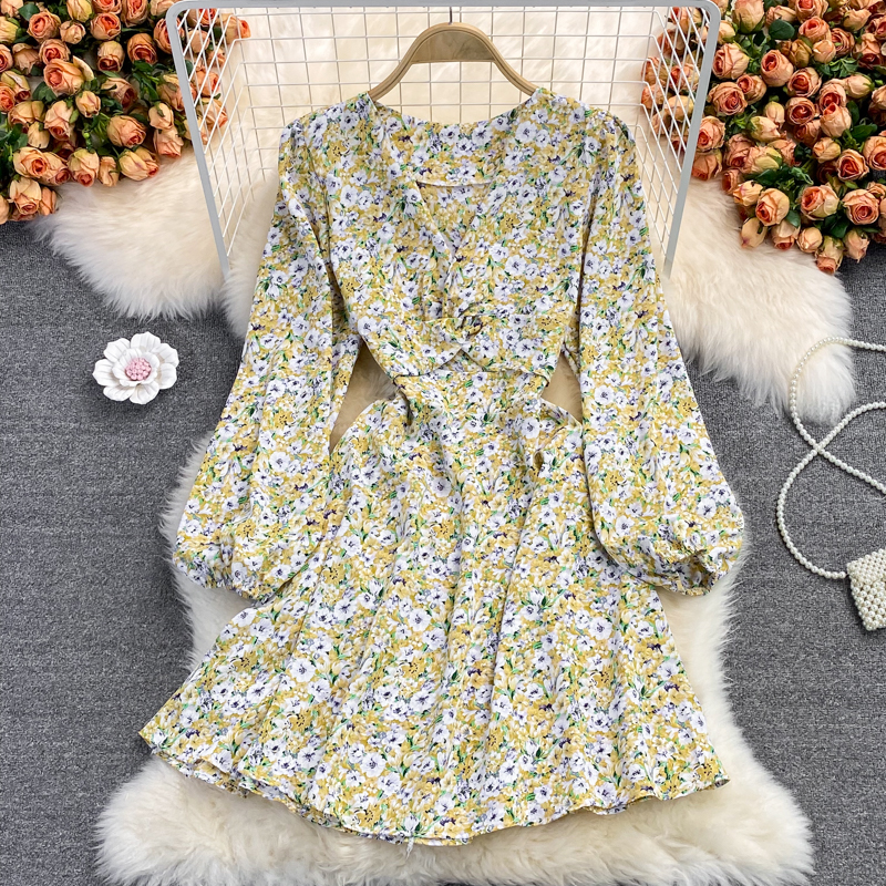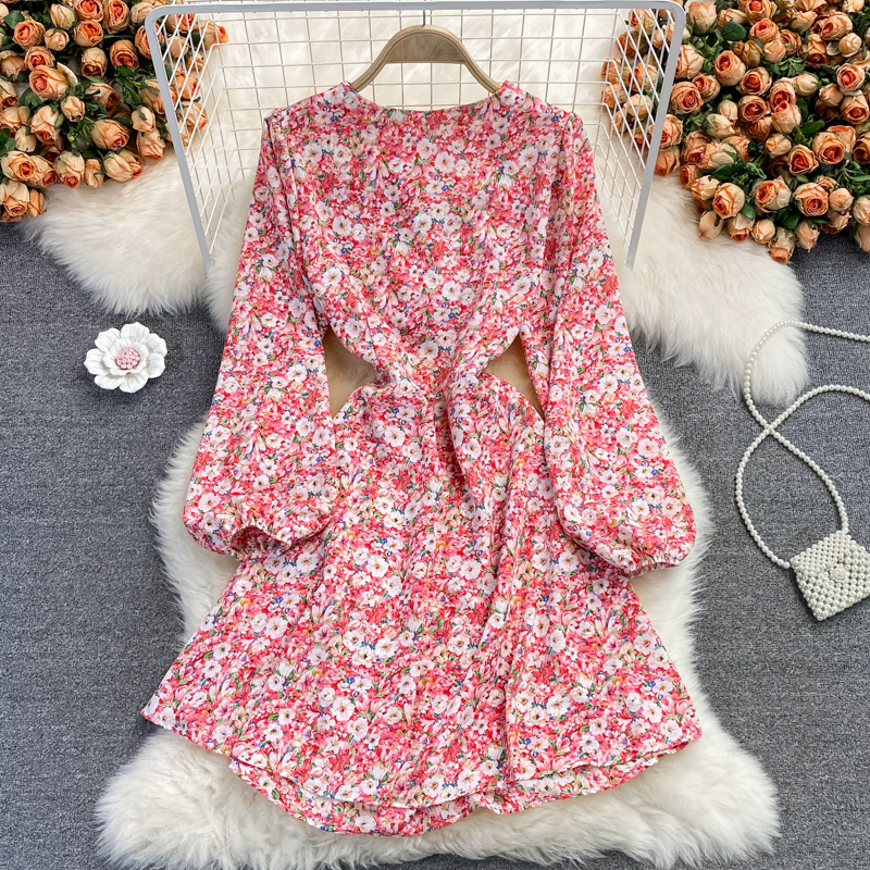 Cheap Dresses, Buy Quality Women’s Clothing Directly from China Suppliers:Autumn French high waisted fairy dress with open waist V neck chiffon dress, retro temperament, waist was thin, floral skirt