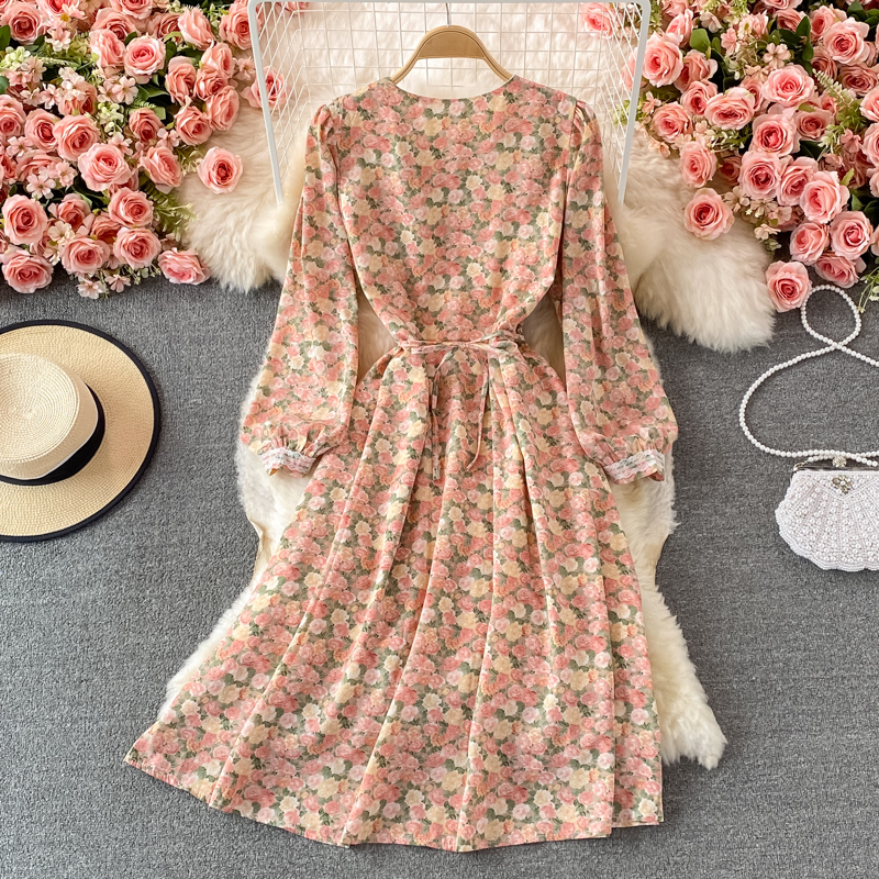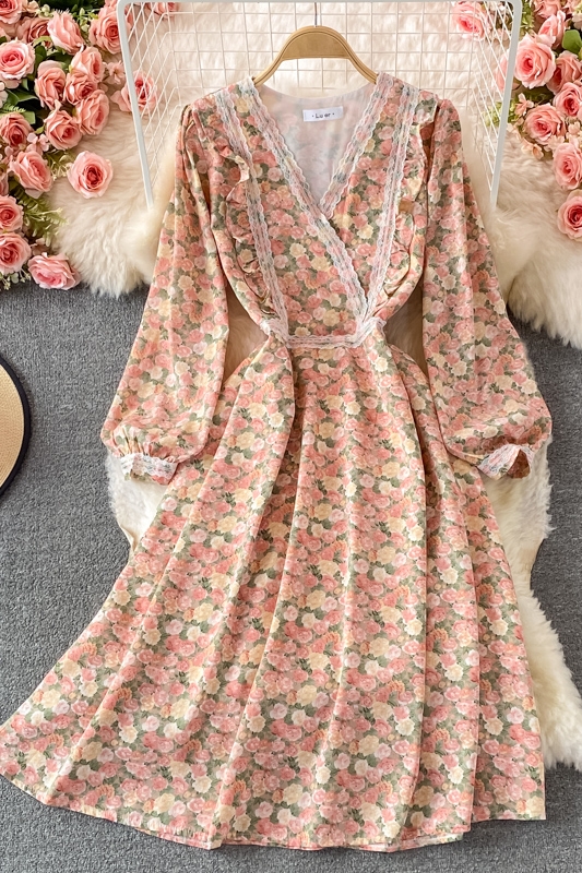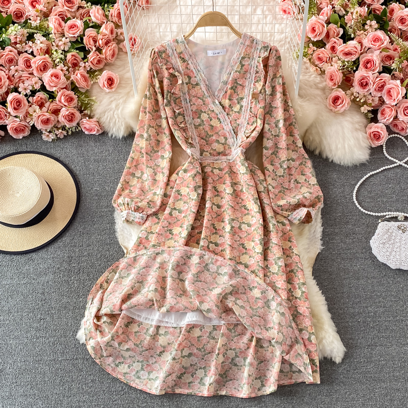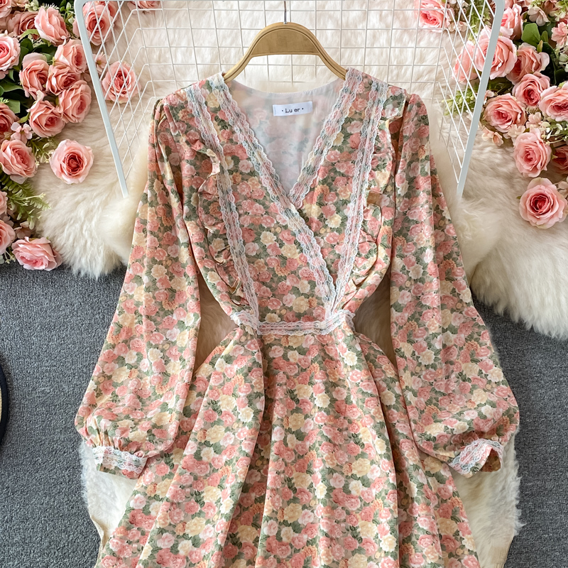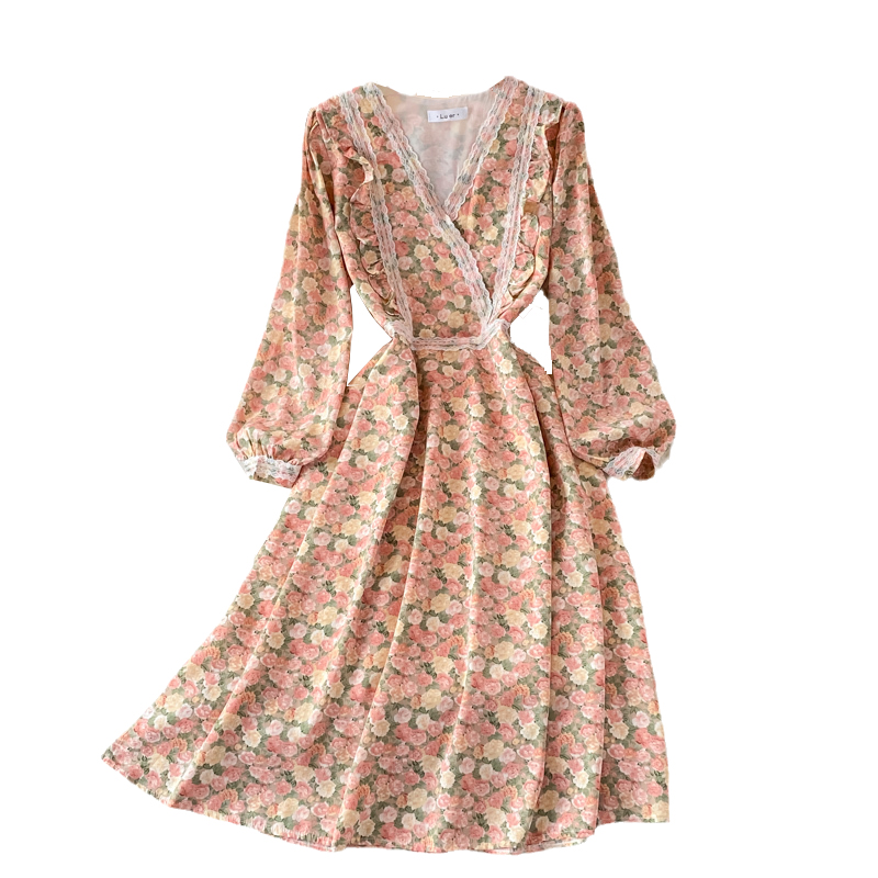 Lace V-neck Chiffon Floral Dress Autumn New French Puff Sleeve Large Swing Dress Tea Dress