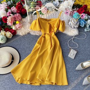 Off-Neck off-the-Shoulder Strap Dress Summer New Korean Style Small over-the-Knee Super Fairy Waist Trimming Yellow Dress
