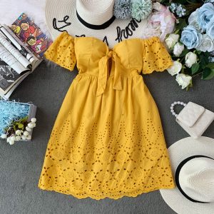 off-Shoulder Cotton Embroidered Backless Lace-up Tube Top High Waist Solid Color Dress Short Sleeve Holiday Dress with Chest Pad